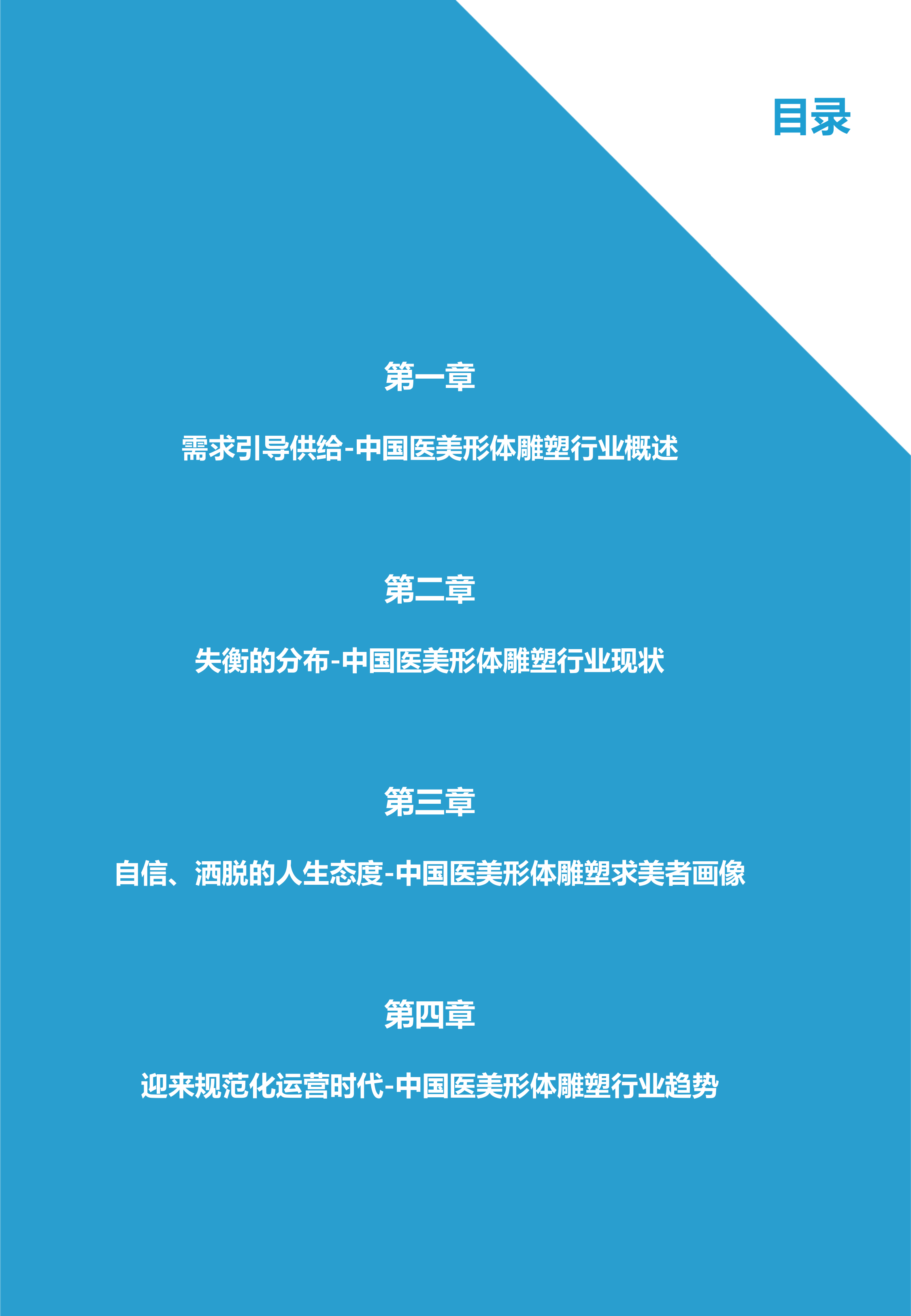 本报告共分为四章,分别从行业概述、现状分析、消费者画像和未来趋势四个方面对中国医美形体雕塑行业进行了深入研究。