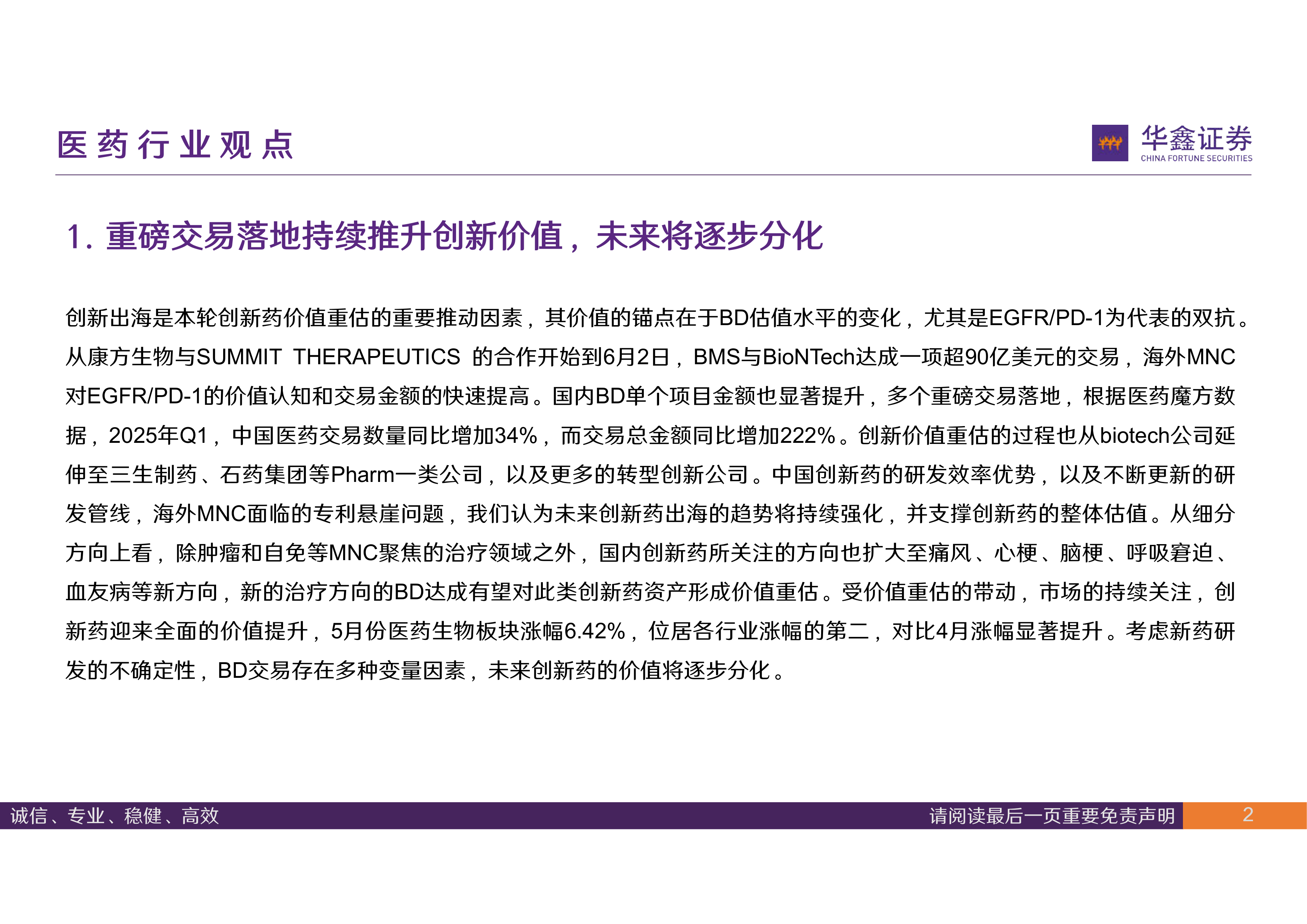 创新出海是本轮创新药价值重估的重要推动因素,其价值的锚点在于BD估值水平的变化,尤其是EGFR/PD-1为代表的双抗。从康方生物与SUMMIT THERAPEUTICS 的合作开始到6月2日,BMS与BioNTech达成一项超90亿美元的交易,海外MNC对EGFR/PD-1的价值认知和交易金额的快速提高。国内BD单个项目金额也显著提升,多个重磅交易落地,根据医药魔方数据,2025年Q1,中国医药交易数量同比增加34%,而交易总金额同比增加222%。创新价值重估的过程也从biotech公司延伸至三生制药、石药集团等Pharm一类公司,以及更多的转型创新公司。中国创新药的研发效率优势,以及不断更新的研发管线,海外MNC面临的专利悬崖问题,我们认为未来创新药出海的趋势将持续强化,并支撑创新药的整体估值。从细分方向上看,除肿瘤和自免等MNC聚焦的治疗领域之外,国内创新药所关注的方向也扩大至痛风、心梗、脑梗、呼吸窘迫、血友病等新方向,新的治疗方向的BD达成有望对此类创新药资产形成价值重估。受价值重估的带动,市场的持续关注,创新药迎来全面的价值提升,5月份医药生物板块涨幅6.42%,位居各行业涨幅的第二,对比4月涨幅显著提升。考虑新药研发的不确定性,BD交易存在多种变量因素,未来创新药的价值将逐步分化。