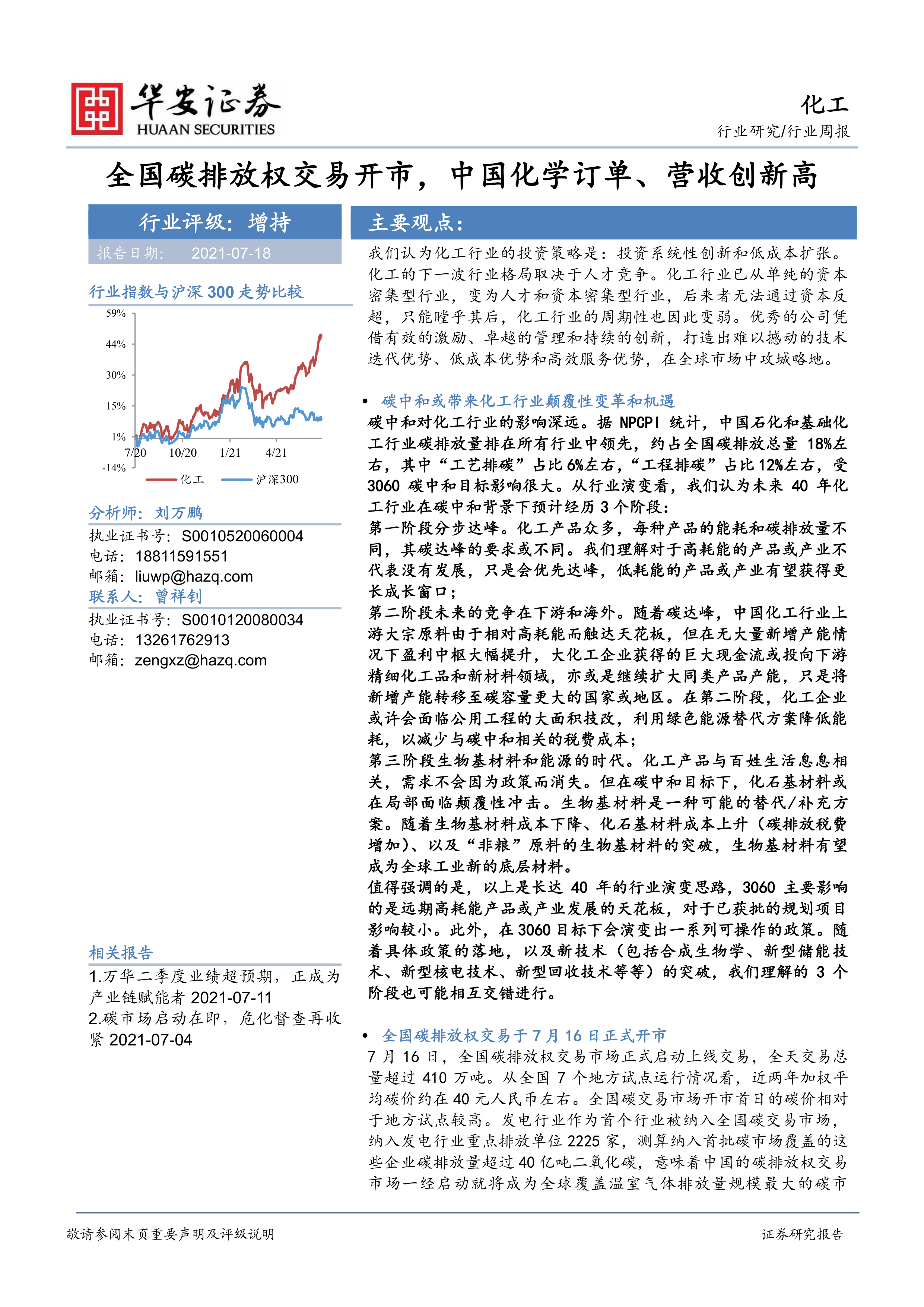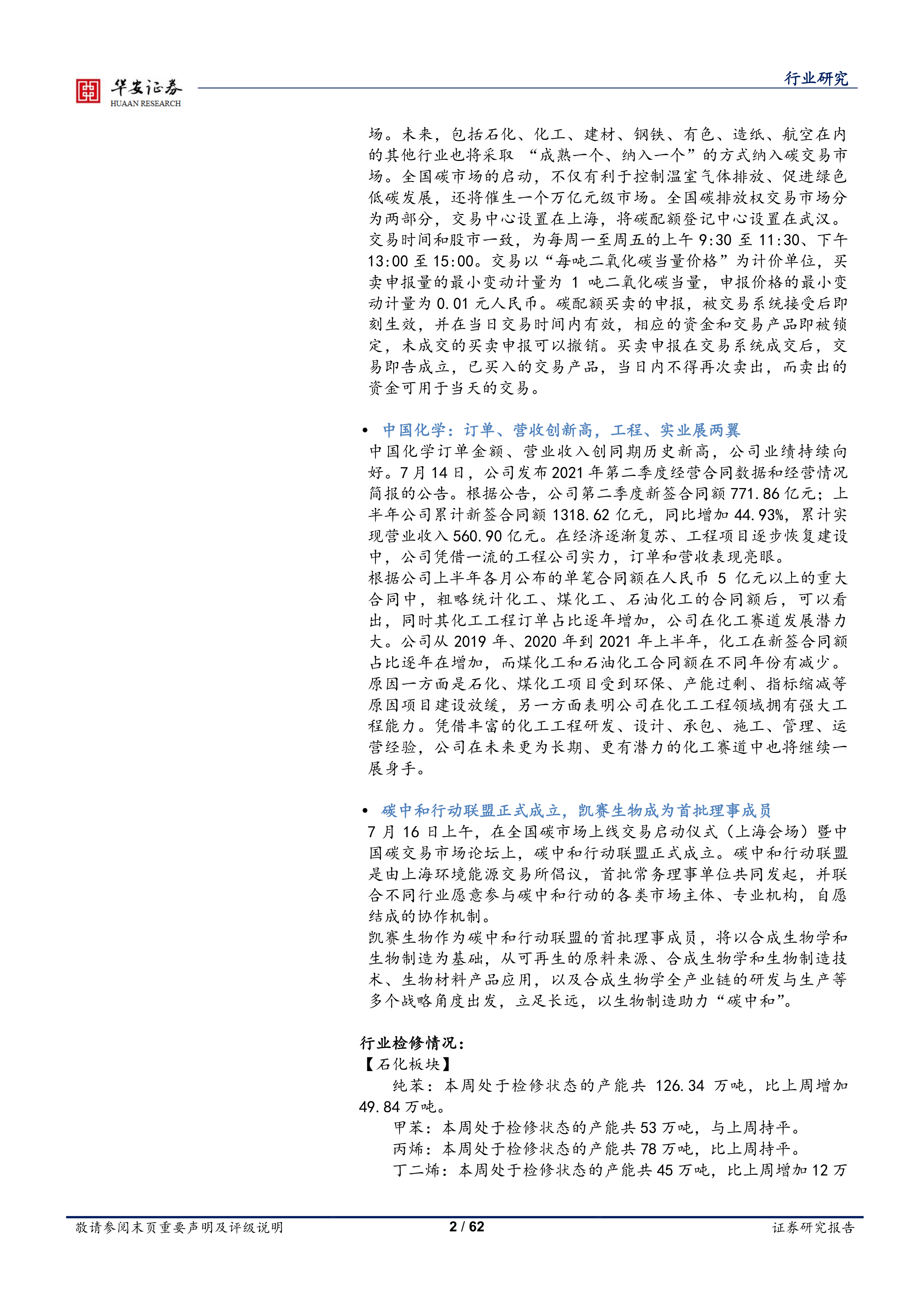 化工行业:全国碳排放权交易开市,中国化学订单、营收创新高