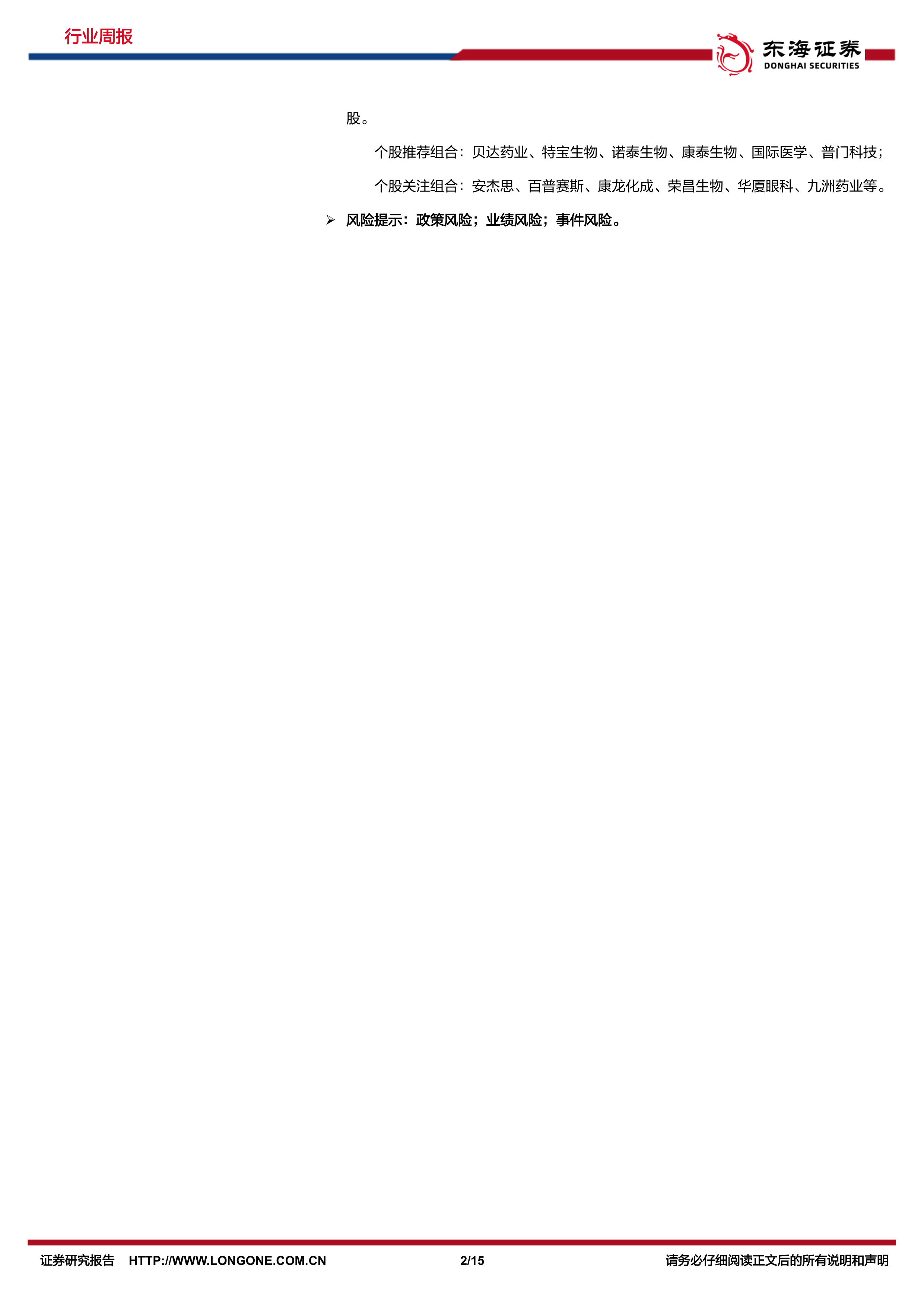 报告基于对市场表现、行业要闻和估值水平的综合分析,建议积极加大对医药生物板块的配置力度,并重点关注创新药链、特色器械、医疗服务消费等细分板块内的优质个股。 报告提供了具体的个股推荐组合和关注组合,并对部分重点公司进行了业绩和公告的简要分析。