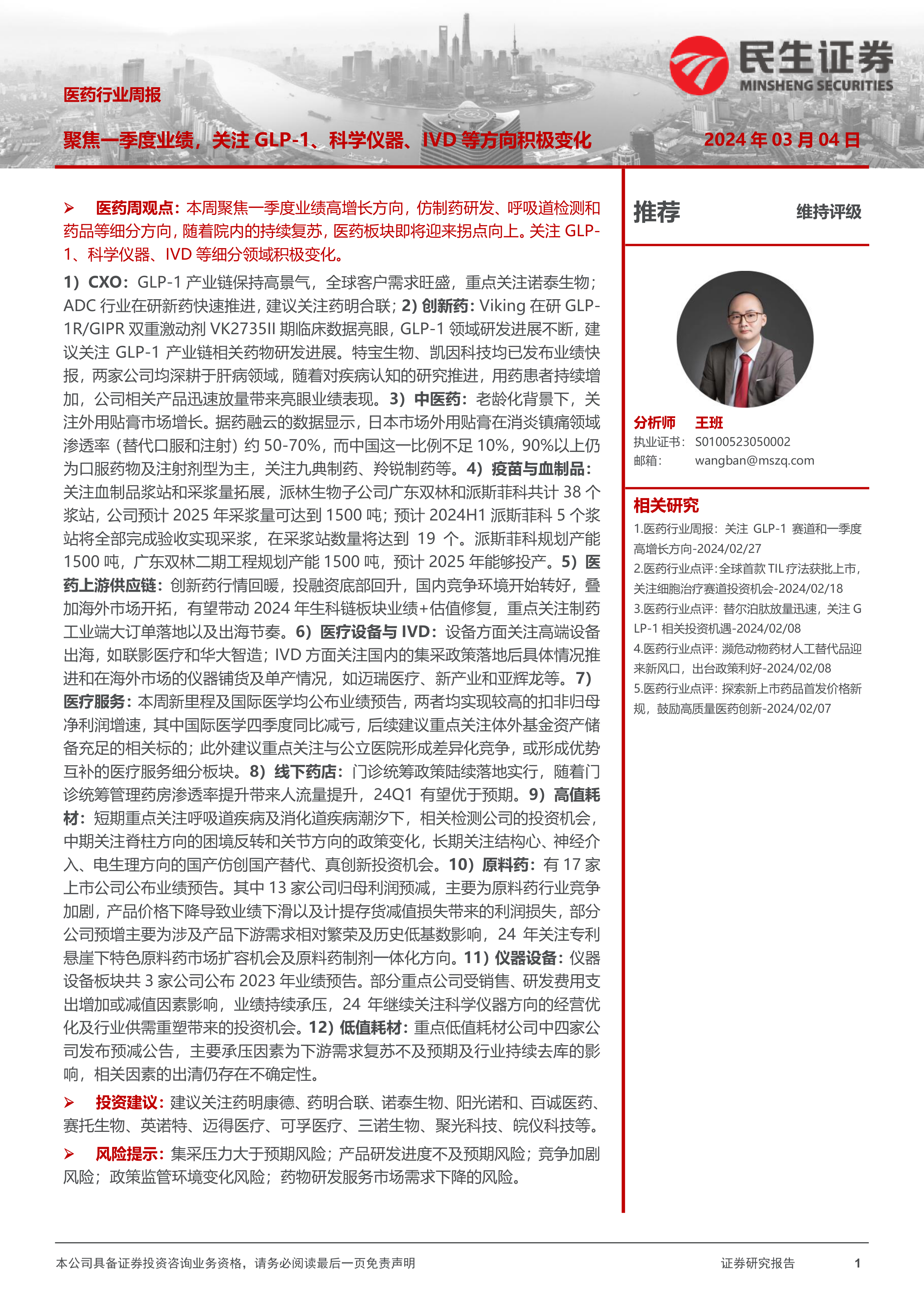 本报告的核心观点是:医药行业一季度业绩高增长方向值得关注,院内复苏将推动医药板块向上拐点。GLP-1、科学仪器和IVD等细分领域表现积极,值得重点关注。同时,报告也分析了CXO、创新药、中医药、疫苗与血制品、医药上游供应链、医疗设备与IVD、医疗服务、线下药店、高值耗材、原料药以及低值耗材等多个细分领域的市场现状及未来发展趋势,并给出相应的投资建议和风险提示。