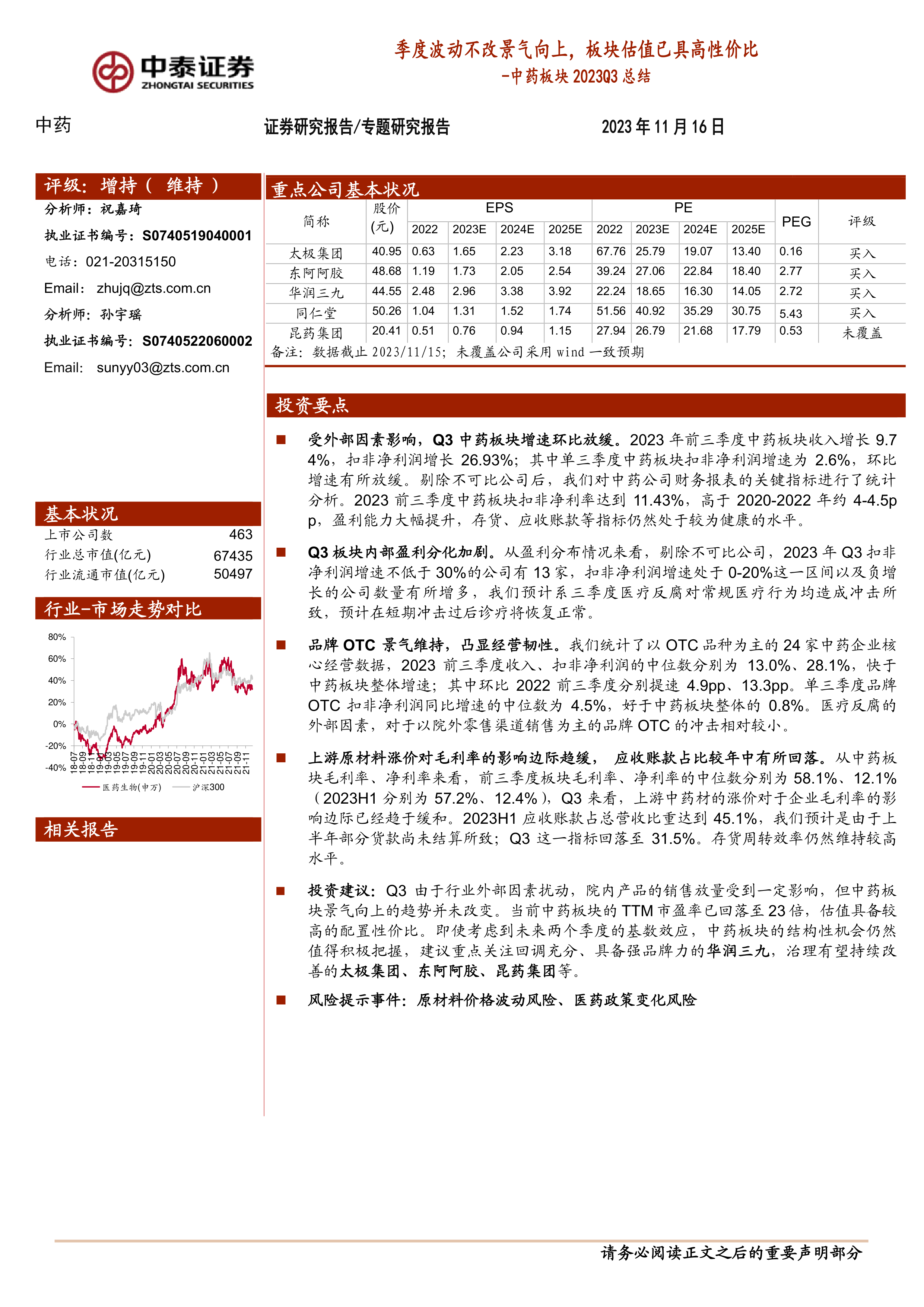 投资建议:Q3由于行业外部因素扰动,院内产品的销售放量受到一定影响,但中药板块景气向上的趋势并未改变。当前中药板块的TTM市盈率已回落至23倍,估值具备较高的配置性价比。即使考虑到未来两个季度的基数效应,中药板块的结构性机会仍然值得积极把握,建议重点关注回调充分、具备强品牌力的华润三九,治理有望持续改善的太极集团、东阿阿胶、昆药集团等。
