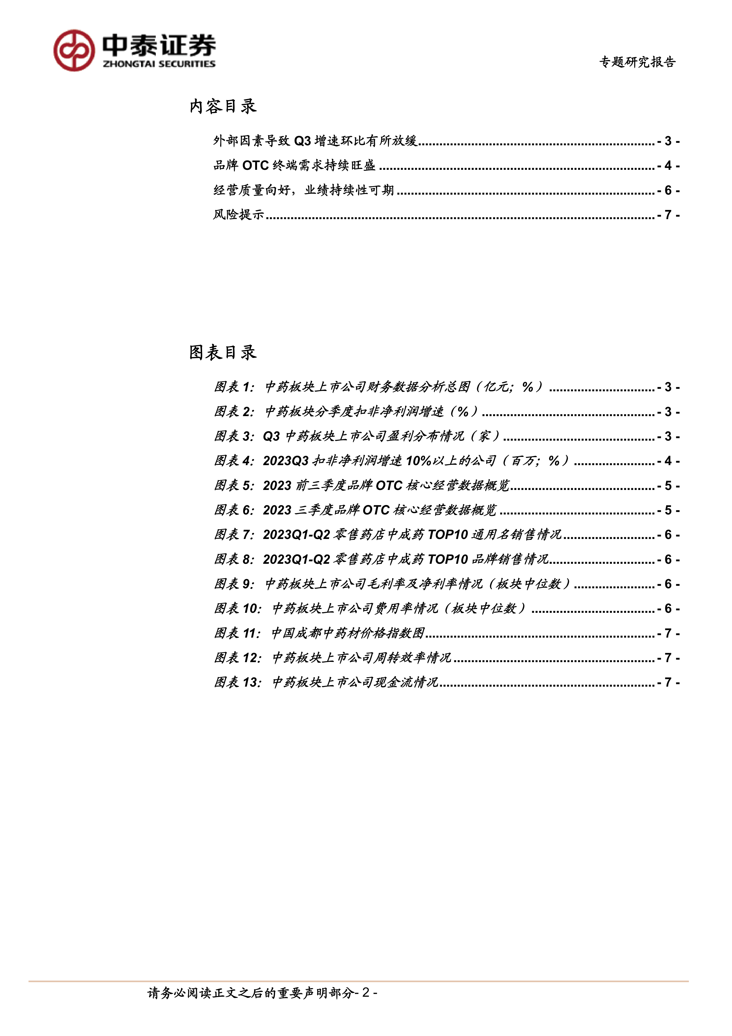 本报告通过对2023年Q3中药板块的财务数据、市场表现和经营质量进行全面分析,得出结论:尽管医疗反腐等外部因素导致Q3中药板块增速环比放缓,但板块整体景气向上的趋势并未改变。品牌OTC市场表现强劲,展现出较强的经营韧性,且中药板块估值已具备较高的配置性价比。 投资者应关注具备强品牌力、经营质量优良的企业,并密切关注医药政策变化和原材料价格波动等风险。 报告中提供的具体公司建议,应结合自身风险承受能力和投资策略进行综合考量。
