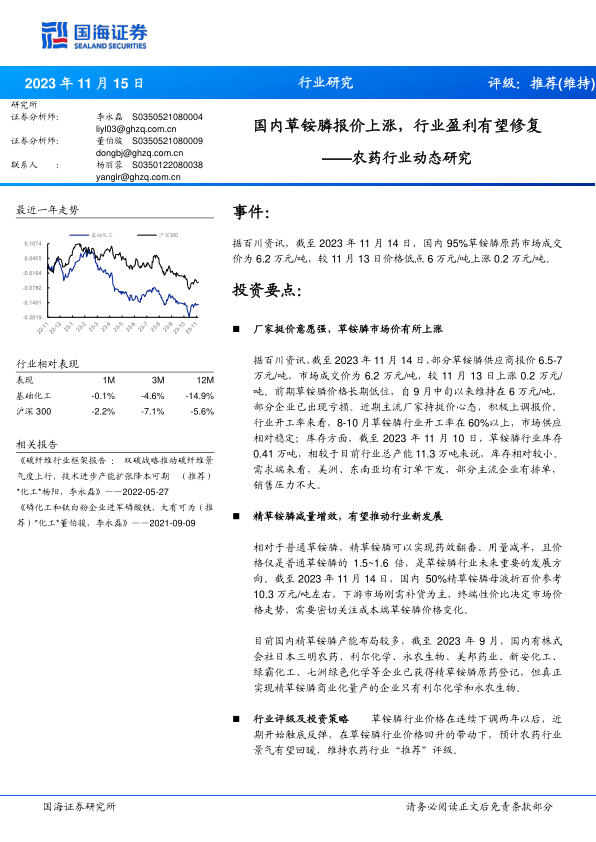 本报告基于对草铵膦市场供需关系、价格走势以及精草铵膦发展前景的分析,认为草铵膦价格上涨将推动行业盈利修复,并维持农药行业“推荐”评级。报告重点关注利尔化学和利民股份两家公司,并提示了潜在的投资风险。 报告数据主要来源于百川资讯和Wind,并结合国海证券研究所的分析,为投资者提供了较为全面的市场分析和投资建议。 然而,投资者仍需谨慎决策,并结合自身情况进行综合判断。