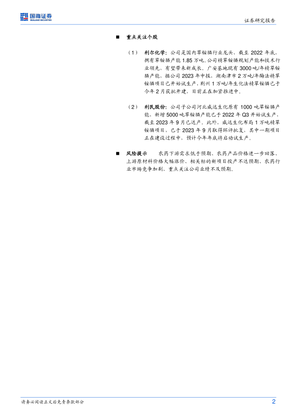 风险提示 农药下游需求低于预期、农药产品价格进一步回落、上游原材料价格大幅涨价、相关标的新项目投产不达预期、农药行业市场竞争加剧、重点关注公司业绩不及预期。