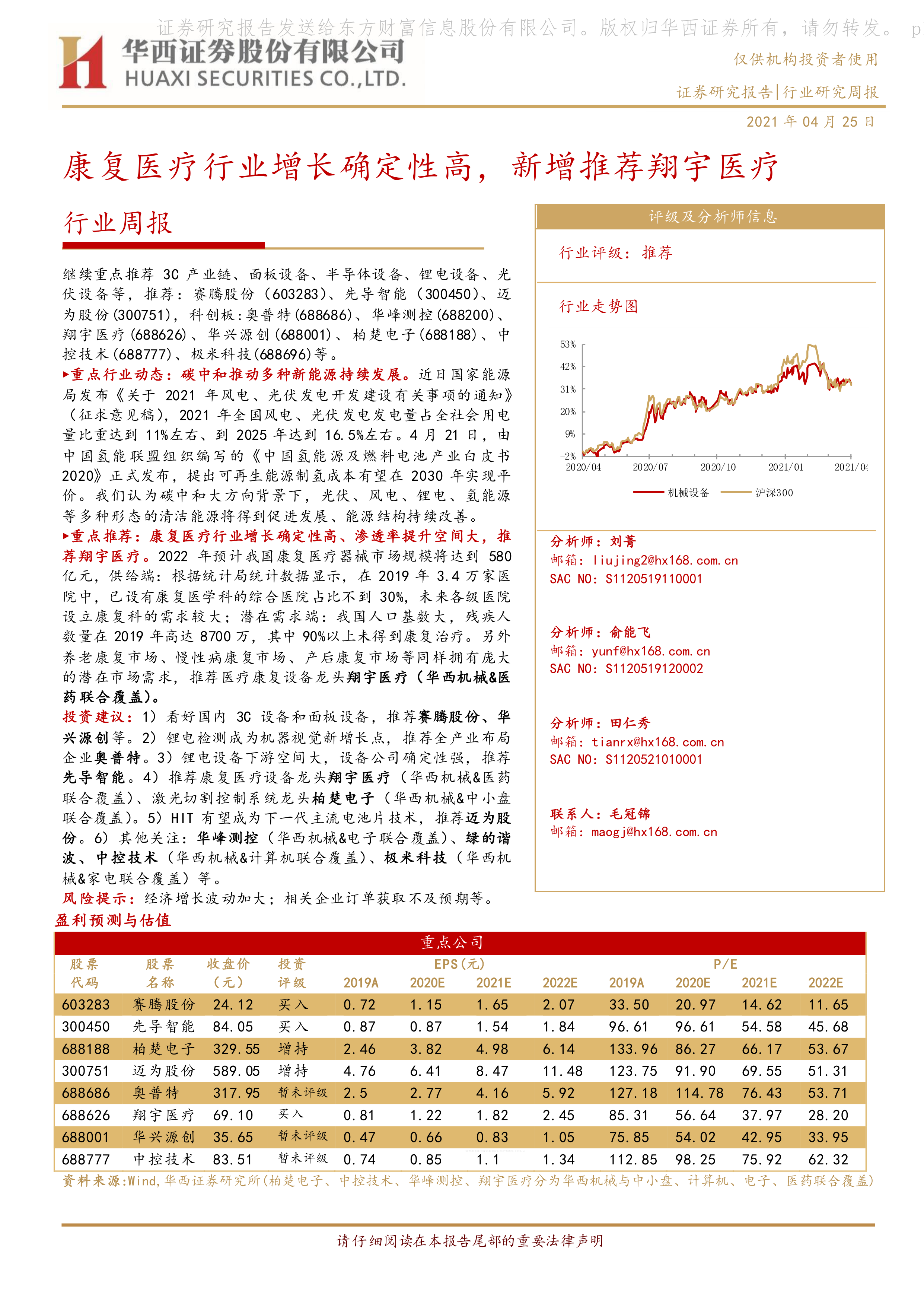 投资建议: 1)看好国内 3C 设备和面板设备,推荐赛腾股份、华兴源创等。 2) 锂电检测成为机器视觉新增长点,推荐全产业布局企业奥普特。 3)锂电设备下游空间大,设备公司确定性强,推荐先导智能。 4) 推荐康复医疗设备龙头翔宇医疗(华西机械&医药联合覆盖) 、激光切割控制系统龙头柏楚电子(华西机械&中小盘联合覆盖)。 5) HIT 有望成为下一代主流电池片技术,推荐迈为股份。 6)其他关注: 华峰测控(华西机械&电子联合覆盖)、 绿的谐波、中控技术(华西机械&计算机联合覆盖) 、 极米科技(华西机械&家电联合覆盖)等。