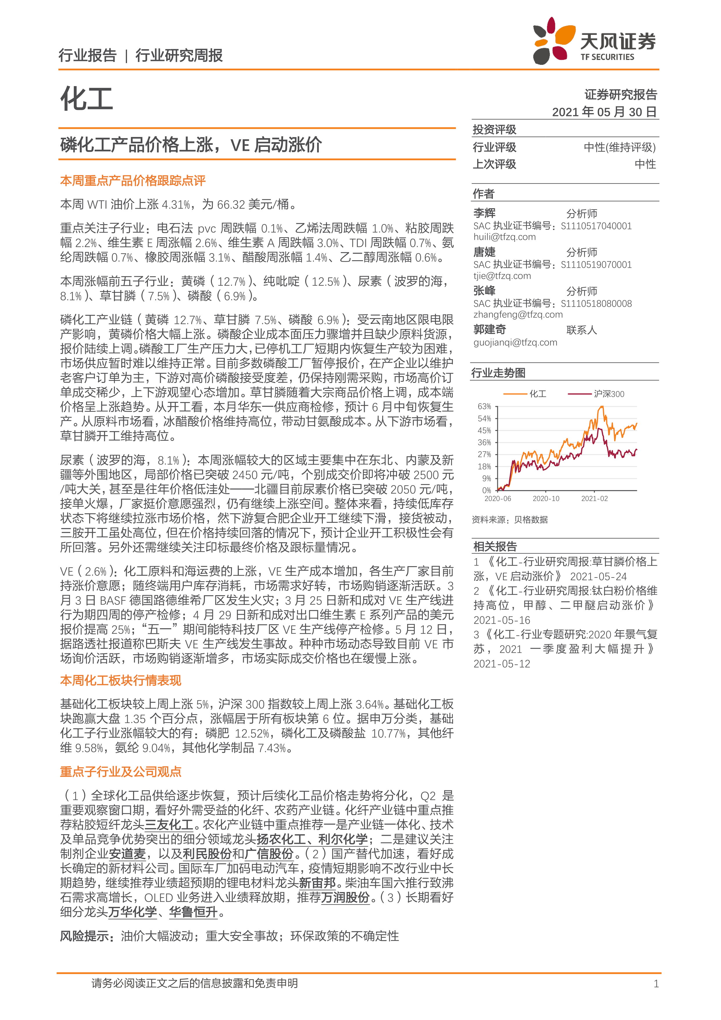 化工行业研究周报:磷化工产品价格上涨,VE启动涨价