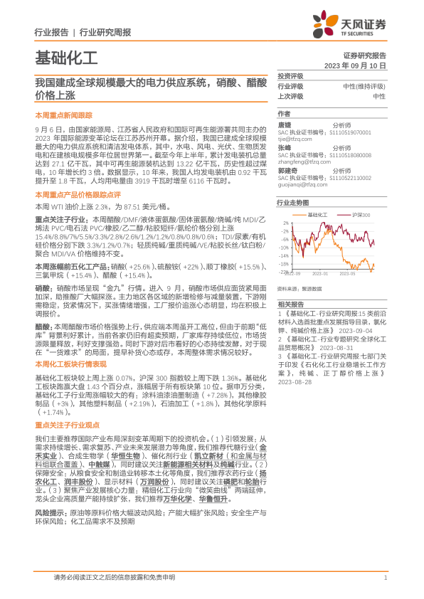 基础化工行业研究周报:我国建成全球规模最大的电力供应系统,硝酸、醋酸价格上涨