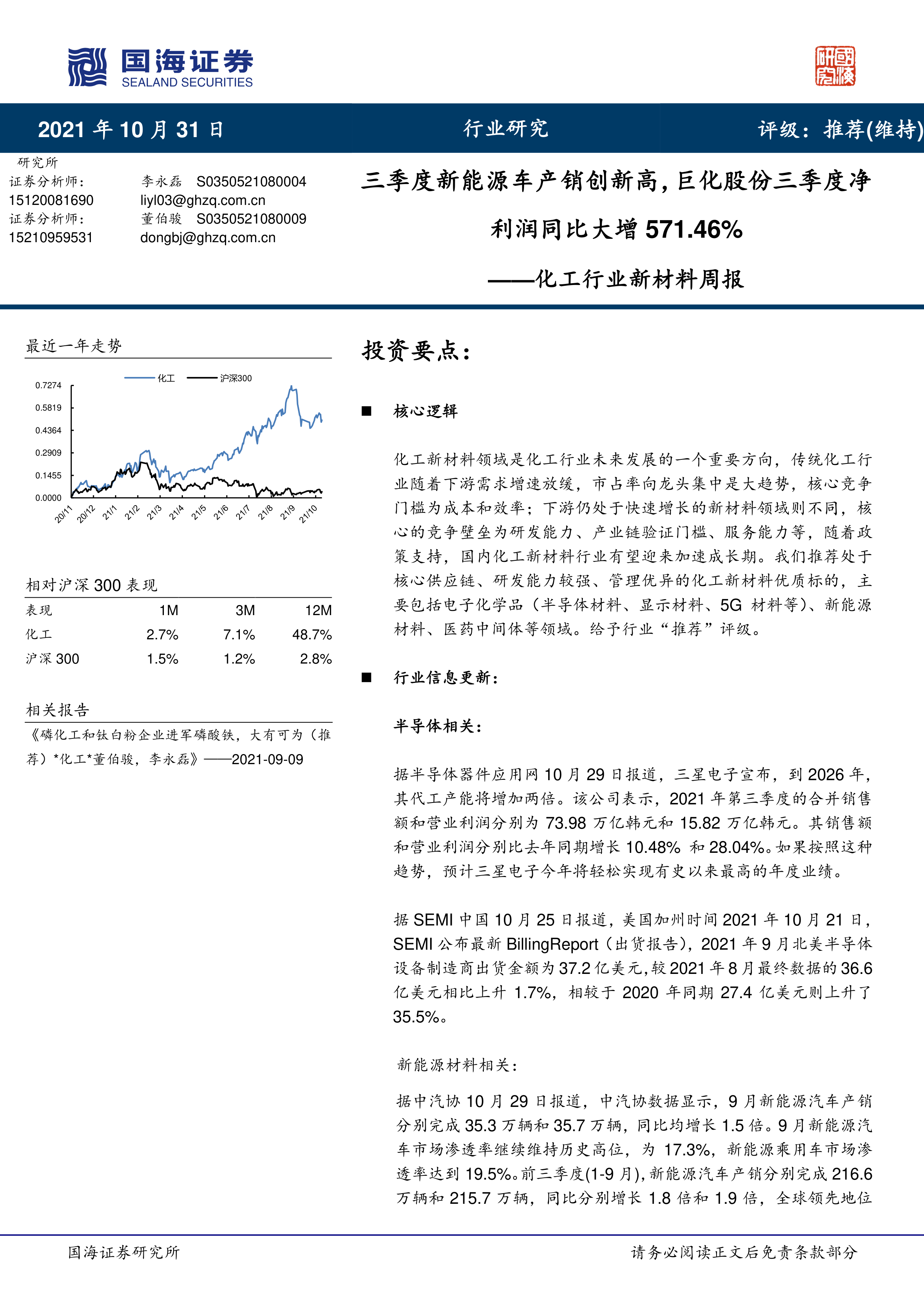 化工行业新材料周报:三季度新能源车产销创新高,巨化股份三季度净利润同比大增571.46%