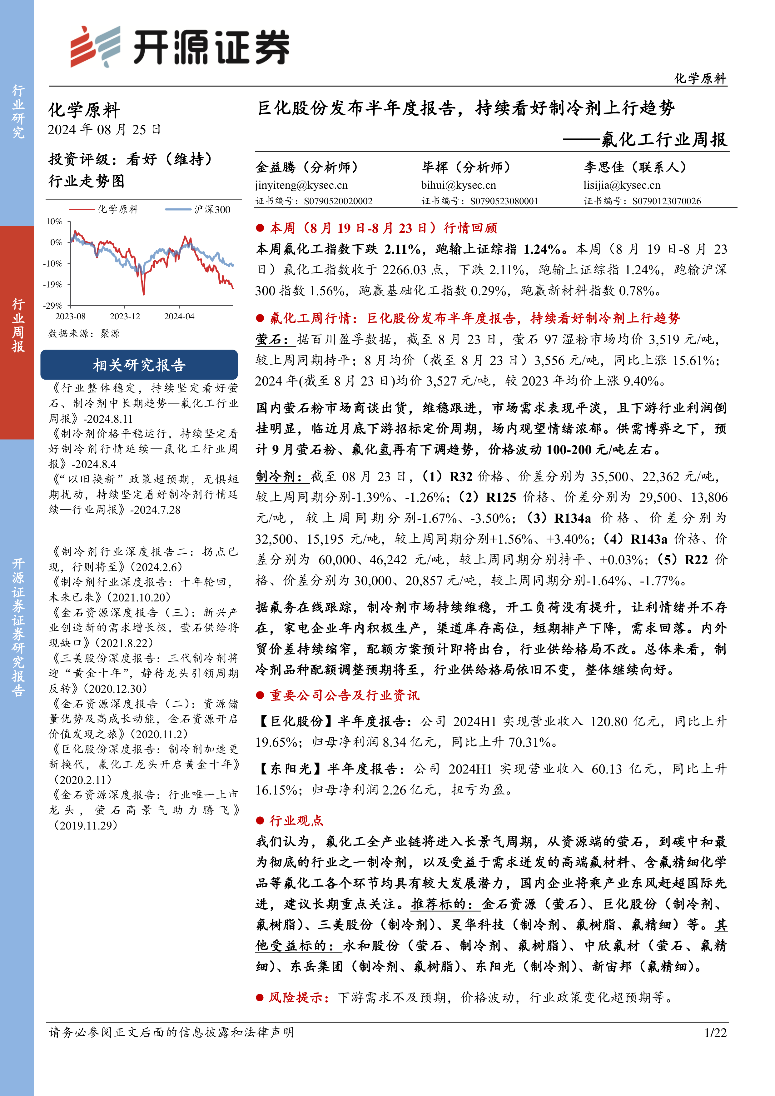 巨化股份、东阳光发布2024年半年报,业绩均有增长。云南瓮福祥丰无水氟化氢项目机械竣工,多氟多磷肥副产氟硅资源综合利用项目一期验收。巨化集团“1002吨/年含氟电子气体提质增效项目”公示。