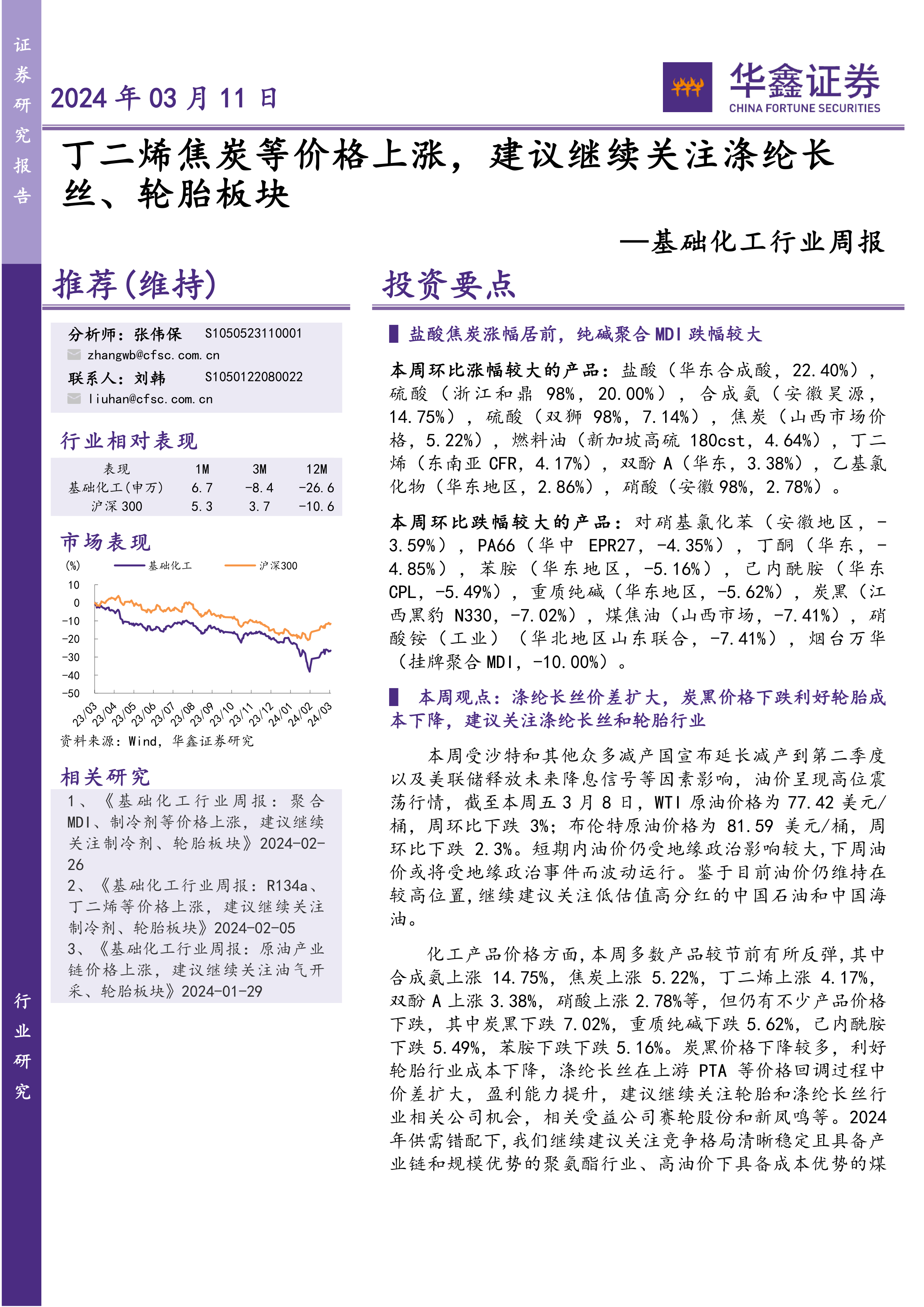 基础化工行业周报:丁二烯焦炭等价格上涨,建议继续关注涤纶长丝、轮胎板块
