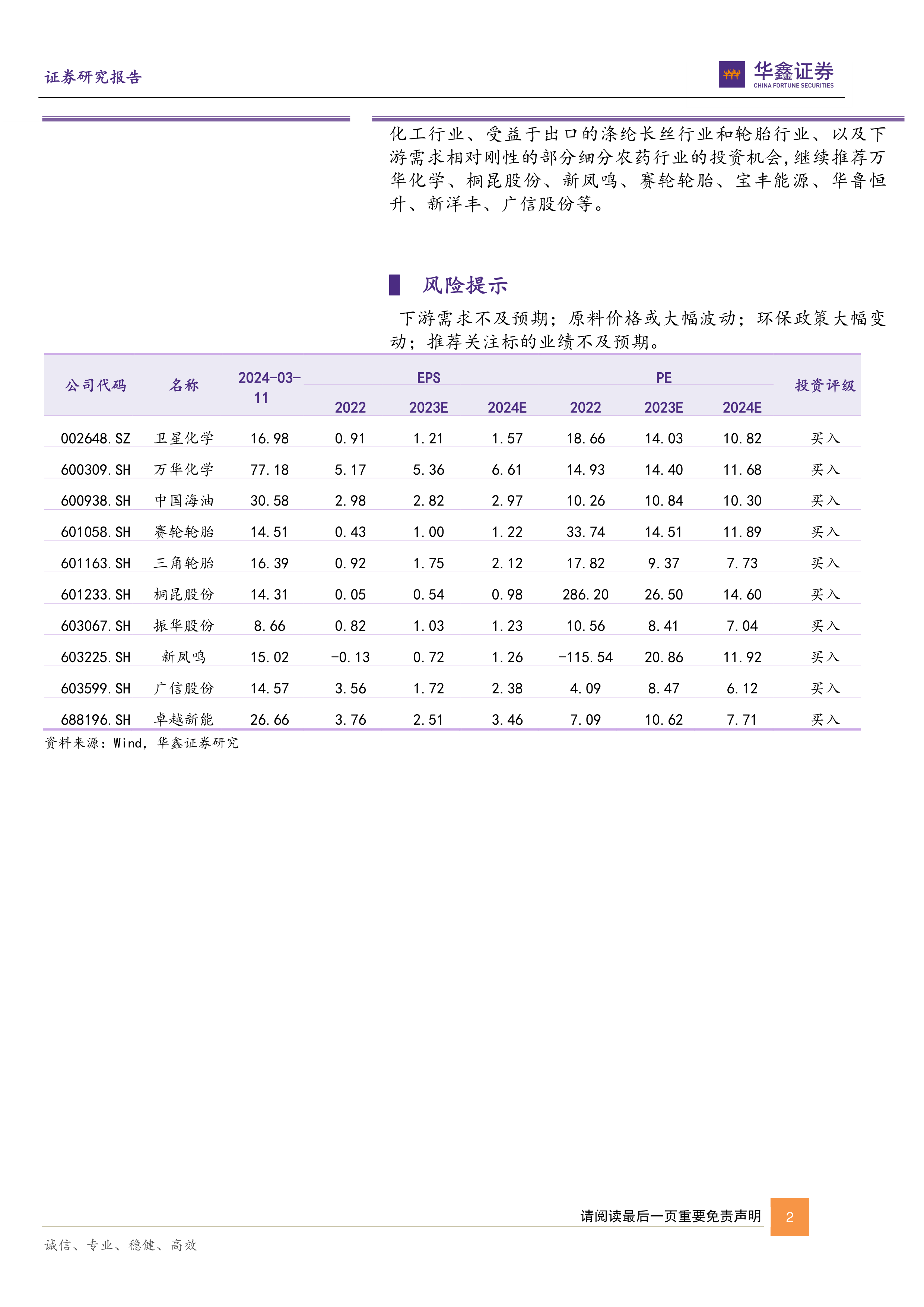 本报告基于对基础化工行业近期价格波动的分析,特别是国际油价波动对下游化工产品价格的影响,以及涤纶长丝和轮胎行业供需格局的变化,建议投资者关注涤纶长丝和轮胎板块的投资机会。报告详细分析了多个化工产品的价格走势,并对多家化工上市公司进行了投资建议,为投资者提供了较为全面的行业和公司分析信息。 然而,投资者需注意报告中提到的风险提示,包括下游需求不及预期、原料价格大幅波动、环保政策变动以及推荐公司业绩不及预期等因素。 最终的投资决策应基于投资者自身的风险承受能力和投资目标。