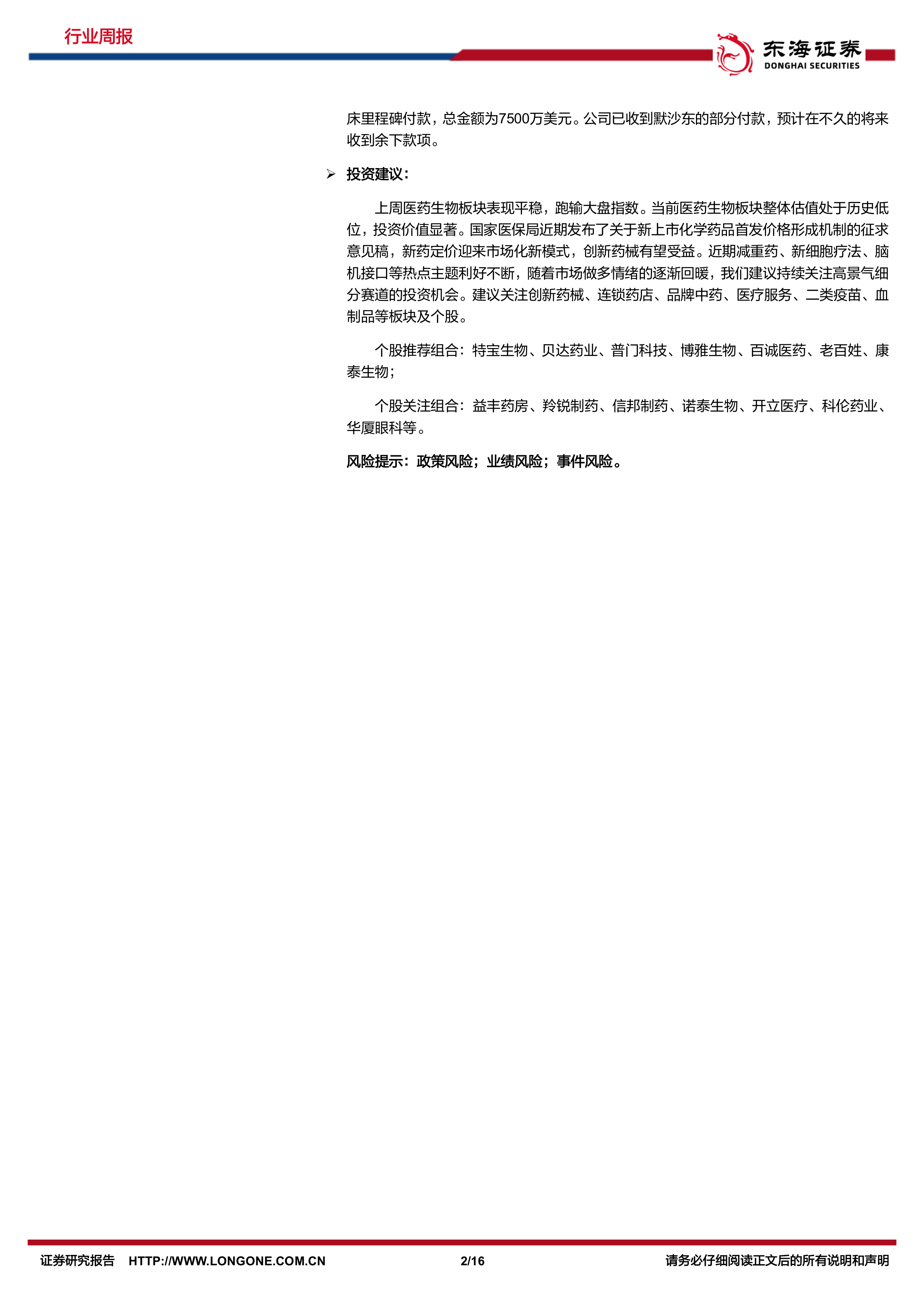个股关注组合:益丰药房、羚锐制药、信邦制药、诺泰生物、开立医疗、科伦药业、华厦眼科等。