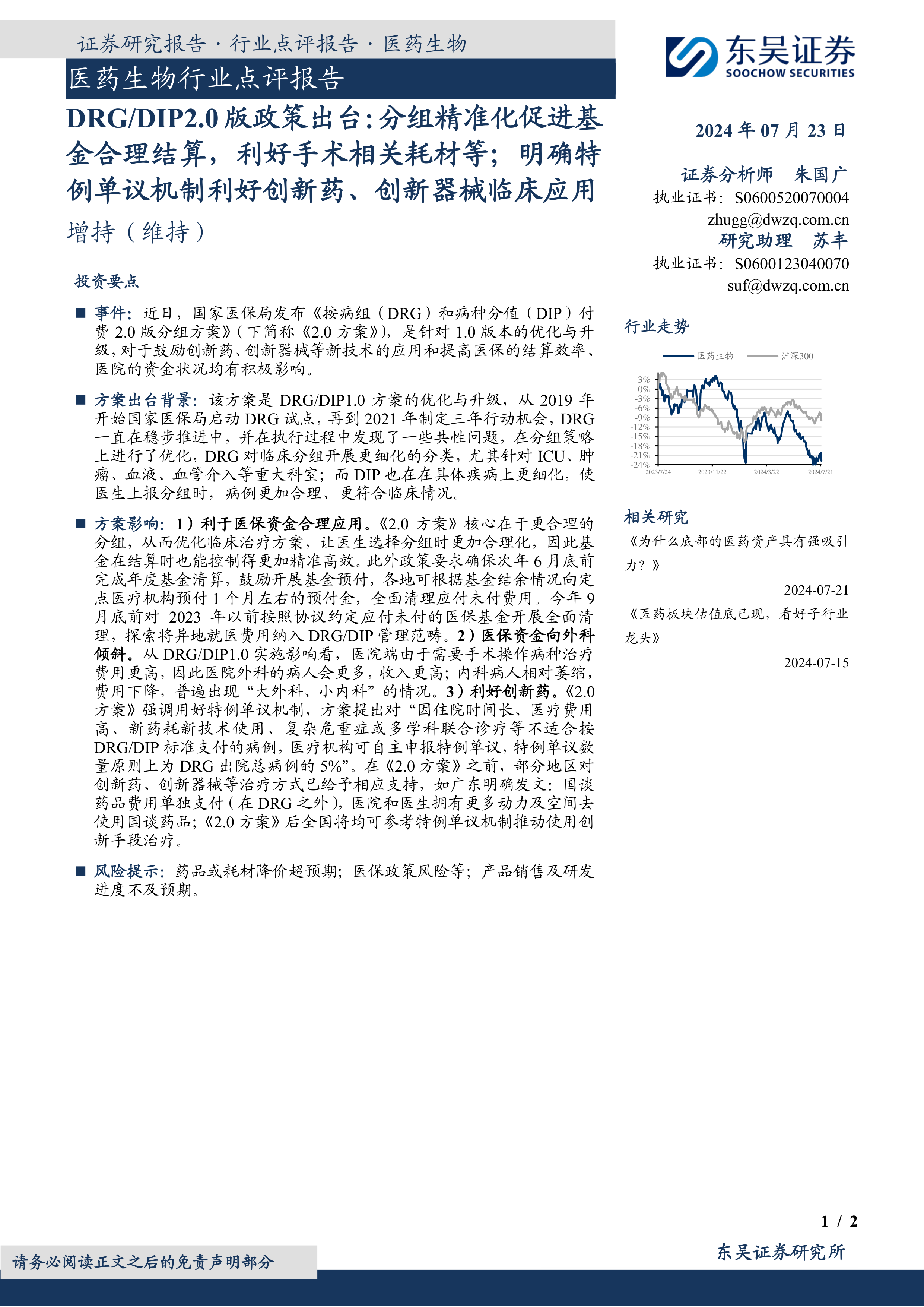 本报告的核心观点是:国家医保局发布的《按病组(DRG)和病种分值(DIP)付费 2.0 版分组方案》(简称《2.0 方案》)对医药生物行业,特别是手术相关耗材和创新药械领域具有积极影响。该方案通过更精准的分组策略,优化医保资金使用效率,促进临床治疗方案的合理化,并通过特例单议机制鼓励创新药械的应用。