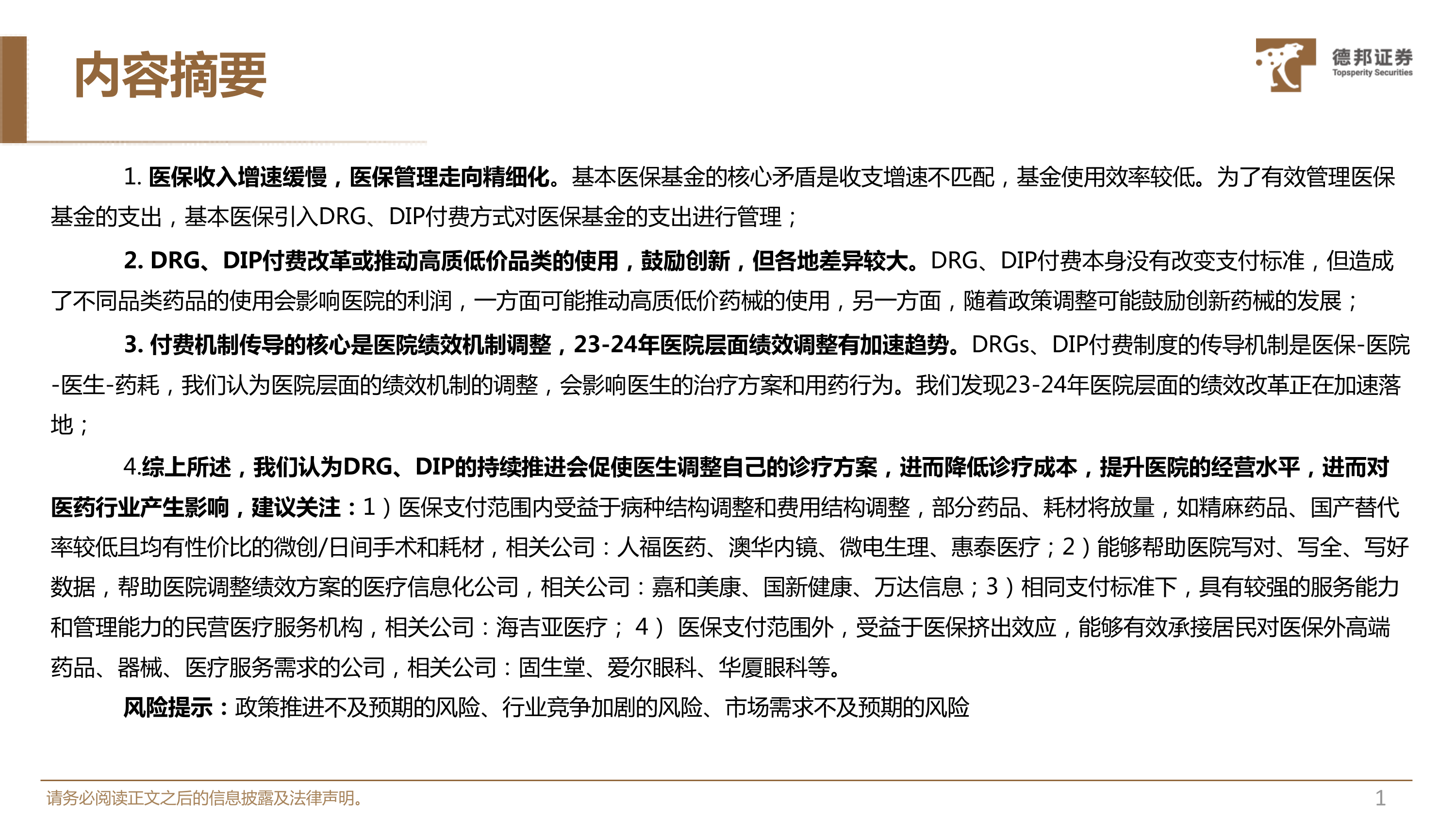 4.综上所述,我们认为DRG、DIP的持续推进会促使医生调整自己的诊疗方案,进而降低诊疗成本,提升医院的经营水平,进而对医药行业产生影响,建议关注:1)医保支付范围内受益于病种结构调整和费用结构调整,部分药品、耗材将放量,如精麻药品、国产替代率较低且均有性价比的微创/日间手术和耗材,相关公司:人福医药、澳华内镜、微电生理、惠泰医疗;2)能够帮助医院写对、写全、写好数据,帮助医院调整绩效方案的医疗信息化公司,相关公司:嘉和美康、国新健康、万达信息;3)相同支付标准下,具有较强的服务能力和管理能力的民营医疗服务机构,相关公司:海吉亚医疗;4)医保支付范围外,受益于医保挤出效应,能够有效承接居民对医保外高端药品、器械、医疗服务需求的公司,相关公司:固生堂、爱尔眼科、华厦眼科等。