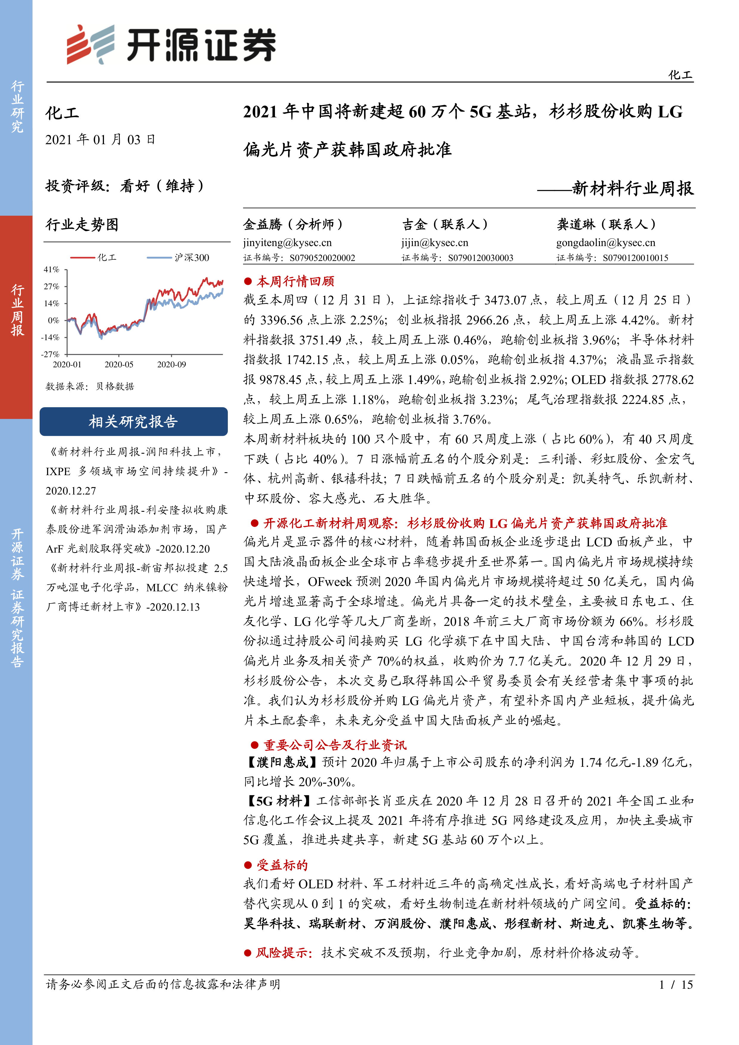新材料行业周报:2021年中国将新建超60万个5G基站,杉杉股份收购LG偏光片资产获韩国政府批准