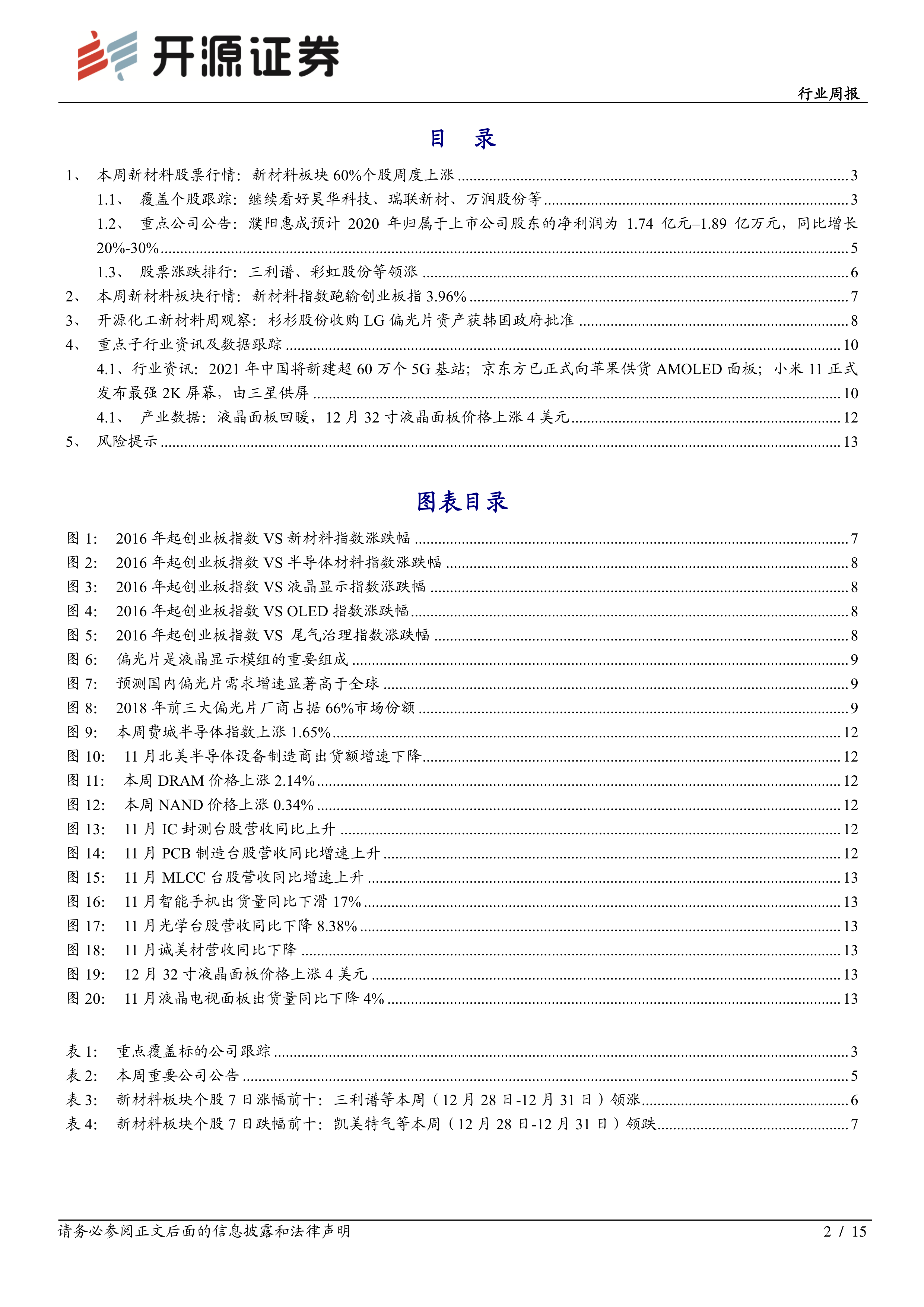 报告对 5G 材料、显示材料、可降解塑料等重点子行业的最新资讯和产业数据进行了跟踪分析。 2021 年中国将新建超 60 万个 5G 基站,这将带动相关 5G 材料的需求增长;液晶面板行业回暖,12 月 32 寸液晶面板价格上涨 4 美元,也为相关材料企业带来利好;京东方向苹果供货 AMOLED 面板,以及小米 11 使用三星供货的 2K 屏幕,都反映了高端显示技术的发展趋势。 报告还关注了康宁保护玻璃的研发进展,以及金晖兆隆生物降解塑料项目的签约等信息。