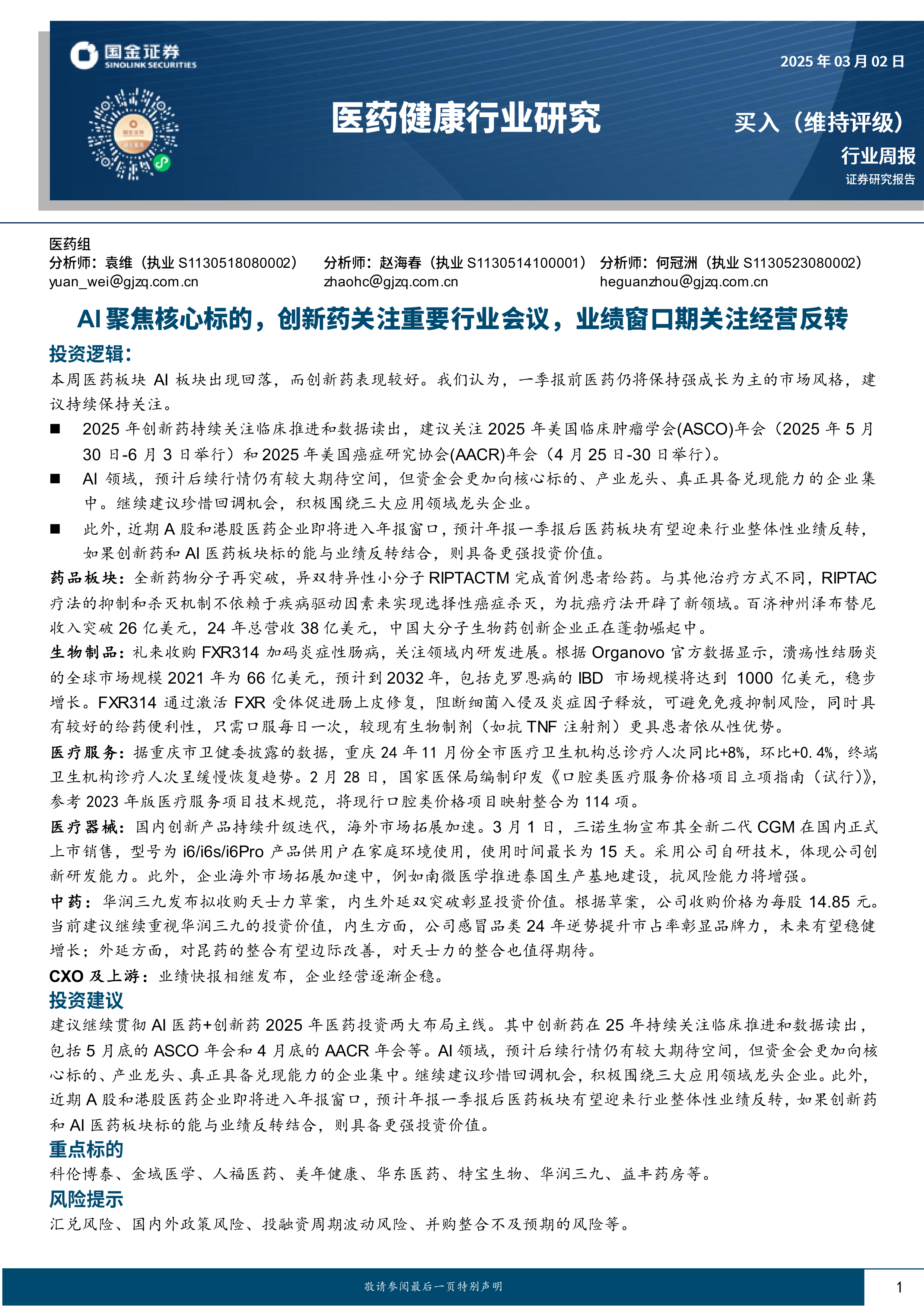 建议继续贯彻AI医药+创新药2025年医药投资两大布局主线。其中创新药在25年持续关注临床推进和数据读出,包括5月底的ASCO年会和4月底的AACR年会等。AI领域,预计后续行情仍有较大期待空间,但资金会更加向核心标的、产业龙头、真正具备兑现能力的企业集中。继续建议珍惜回调机会,积极围绕三大应用领域龙头企业。此外,近期A股和港股医药企业即将进入年报窗口,预计年报一季报后医药板块有望迎来行业整体性业绩反转,如果创新药和AI医药板块标的能与业绩反转结合,则具备更强投资价值。