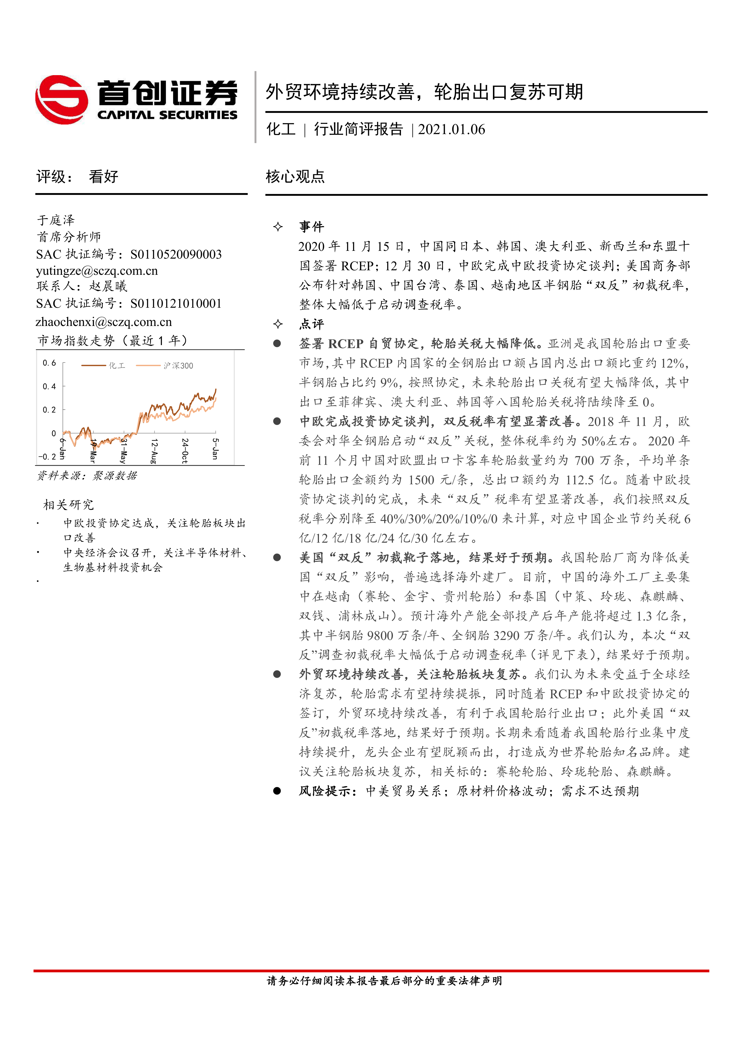 本报告的核心观点是:受益于RCEP和中欧投资协定的签署以及美国“双反”初裁结果好于预期,中国轮胎出口面临的外部环境持续改善,未来出口复苏可期。 同时,中国轮胎企业积极布局海外产能,也为应对国际贸易摩擦和提升竞争力提供了有力支撑。 但仍需关注中美贸易关系、原材料价格波动以及需求不达预期等潜在风险。