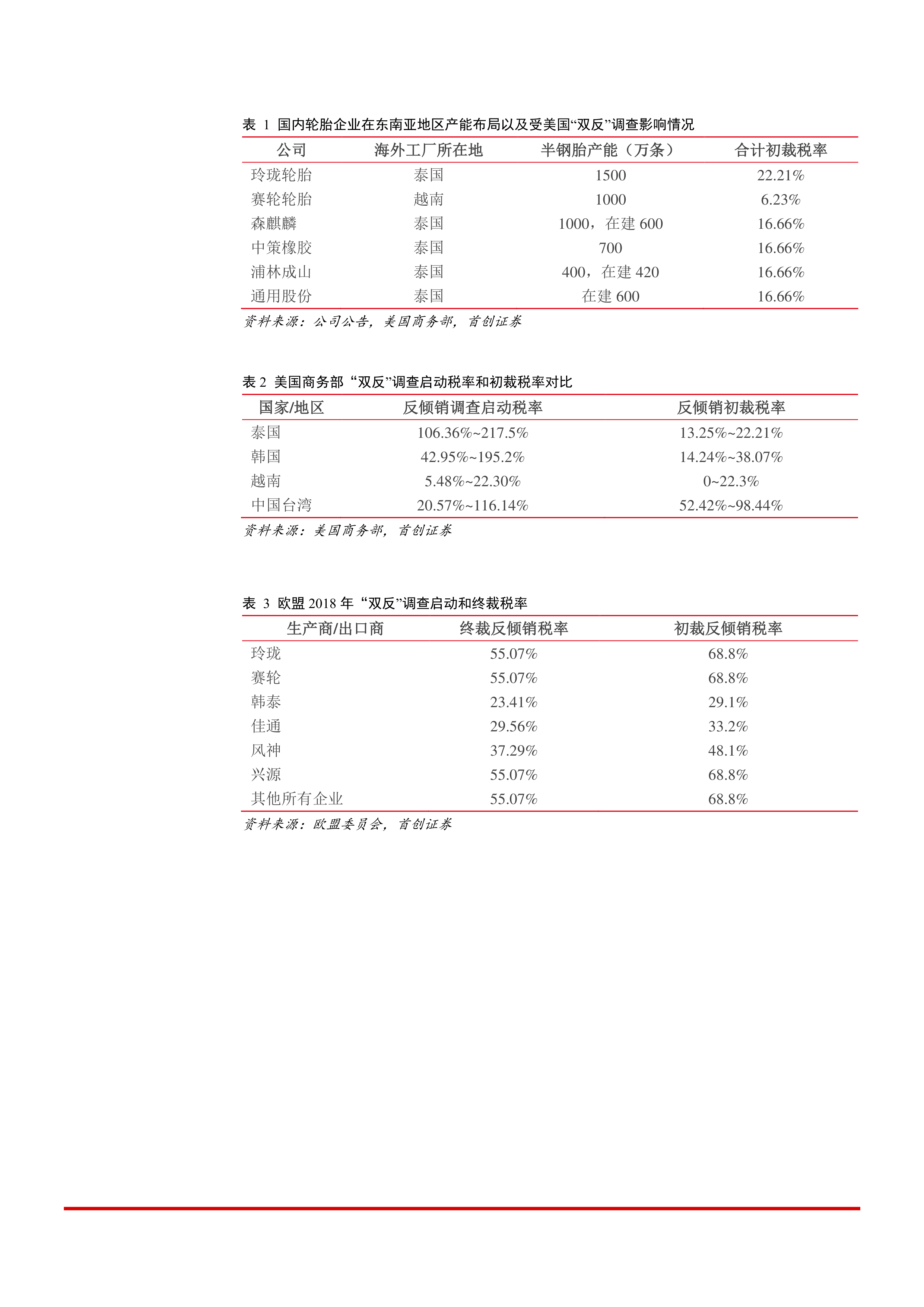 美国“双反”初裁靴子落地,结果好于预期。我国轮胎厂商为降低美国“双反”影响,普遍选择海外建厂。目前,中国的海外工厂主要集中在越南(赛轮、金宇、贵州轮胎)和泰国(中策、玲珑、森麒麟、双钱、浦林成山)。预计海外产能全部投产后年产能将超过1.3亿条,其中半钢胎9800万条/年、全钢胎3290万条/年。我们认为,本次“双反”调查初裁税率大幅低于启动调查税率(详见下表),结果好于预期。