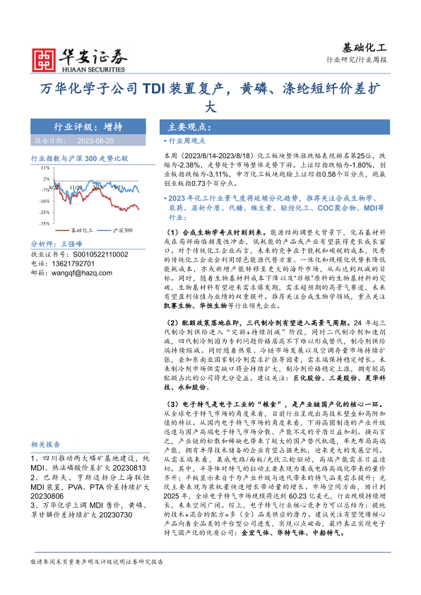 基础化工行业周报:万华化学子公司TDI装置复产,黄磷、涤纶短纤价差扩大