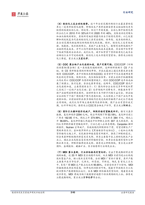 报告最后列出了化工行业面临的风险,包括政策扰动、技术扩散、新技术突破、全球知识产权争端、全球贸易争端、碳排放趋严、油价大幅下跌以及经济大幅下滑等。
