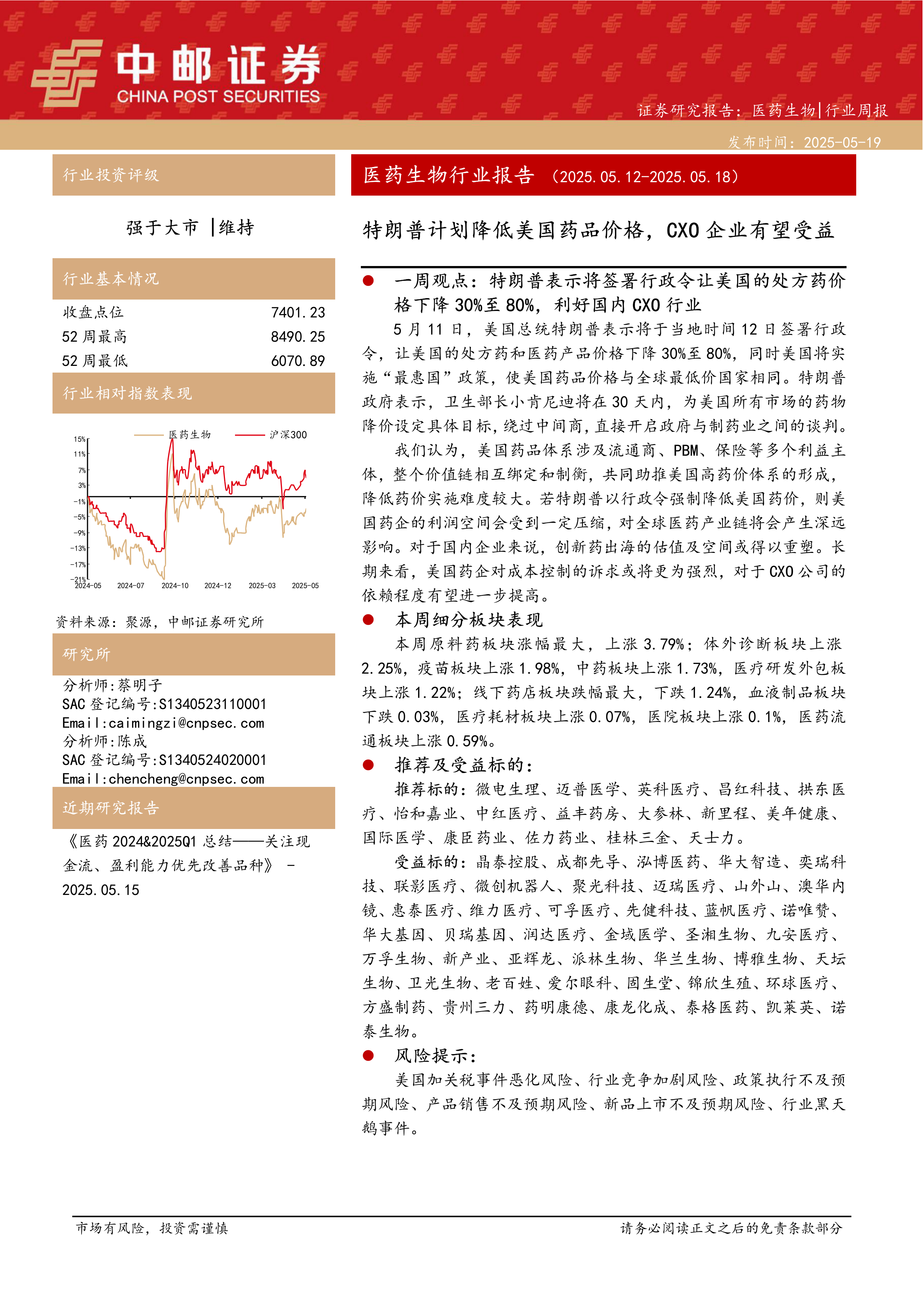 本报告基于特朗普计划降低美国药品价格这一重大事件,分析了其对全球医药产业链以及国内CXO行业的影响,并对本周医药生物板块的整体表现和细分板块的投资机会进行了深入分析。报告认为,特朗普的政策虽然实施难度较大,但若成功实施,将利好国内CXO行业。同时,报告也提示了潜在的投资风险,为投资者提供了较为全面的市场分析和投资建议。 报告中提供的推荐标的和受益标的,需结合自身风险承受能力和投资策略进行综合考量。