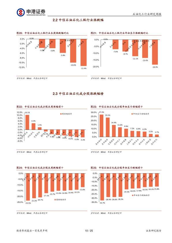 报告回顾了本周中信石油石化指数的跌幅,以及石油开采、油品销售、炼油和其他石化行业的表现。同时,报告还列出了中信石油石化成分股本周涨跌幅前十的股票,并对部分重点石化原料产品(如原油、动力煤、LNG、汽油、柴油、石脑油、乙烯、聚乙烯、EO、EG、PVC、丙烷、丙烯、聚丙烯、丁烷、LPG、苯、苯乙烯、聚苯乙烯、甲苯、二甲苯等)的价格走势进行了详细的图表展示和分析。