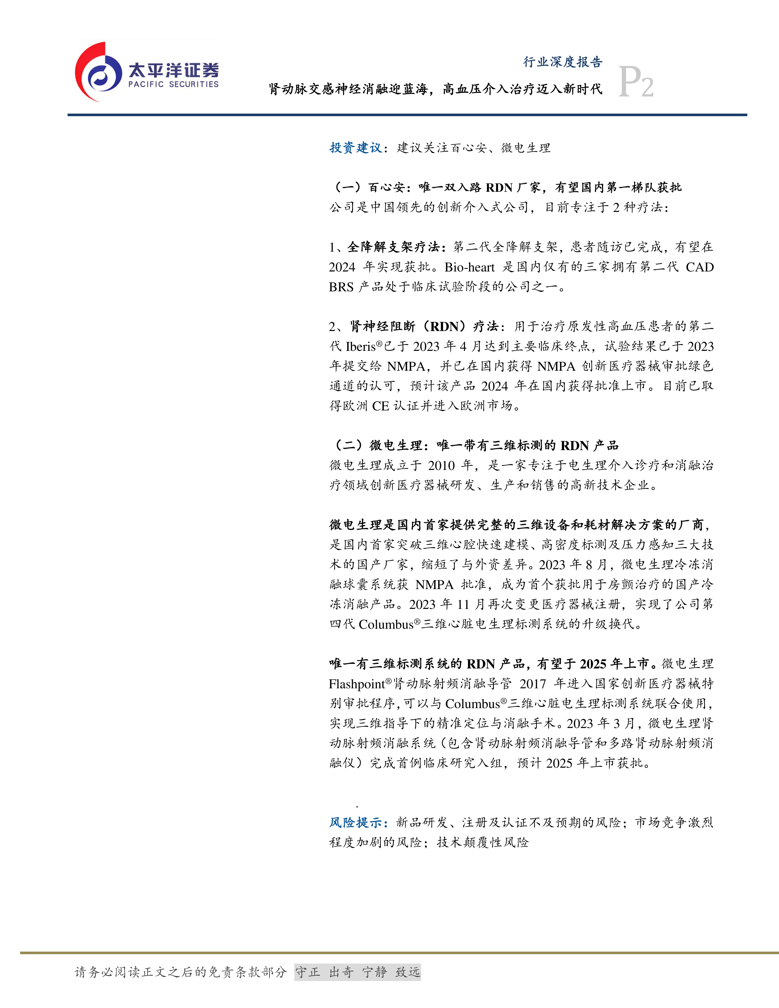 本节是报告的核心部分,重点推荐了百心安和微电生理两家公司作为投资标的。对两家公司的产品管线、研发进展、市场竞争优势等进行了详细分析,并结合市场前景和公司发展战略,阐述了投资建议的理由。 百心安作为唯一双入路RDN厂家,其产品有望在2024年国内获批上市;微电生理则拥有唯一带有三维标测的RDN产品,技术优势明显,预计2025年上市。