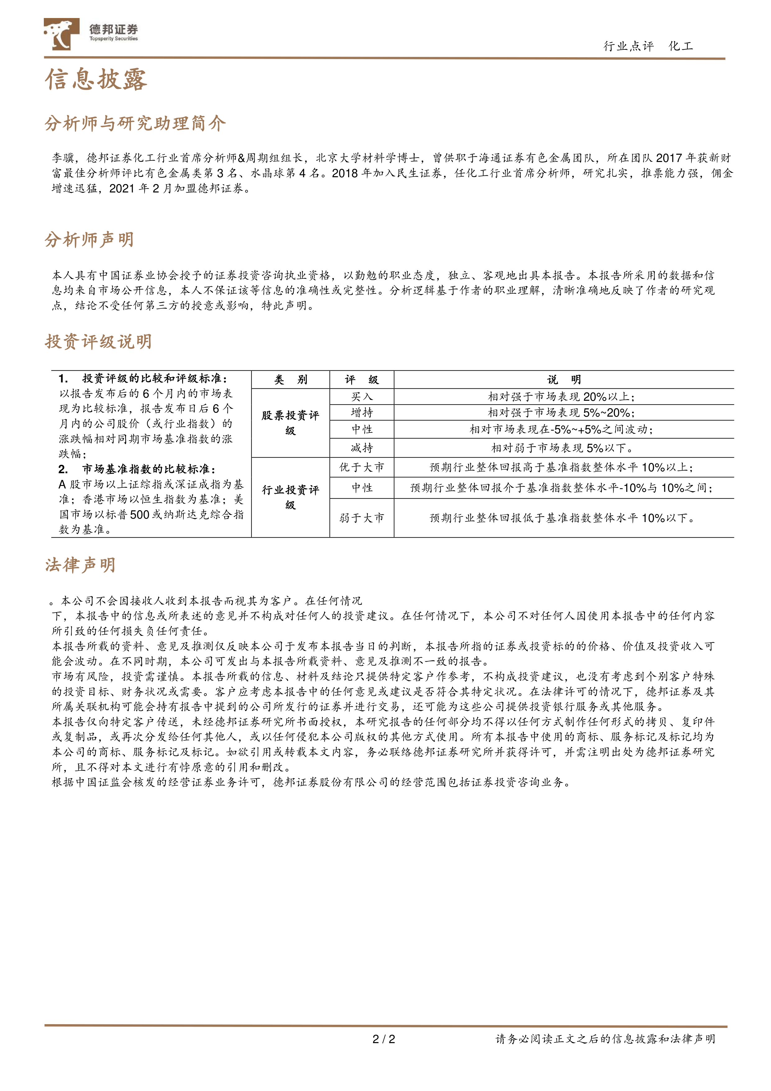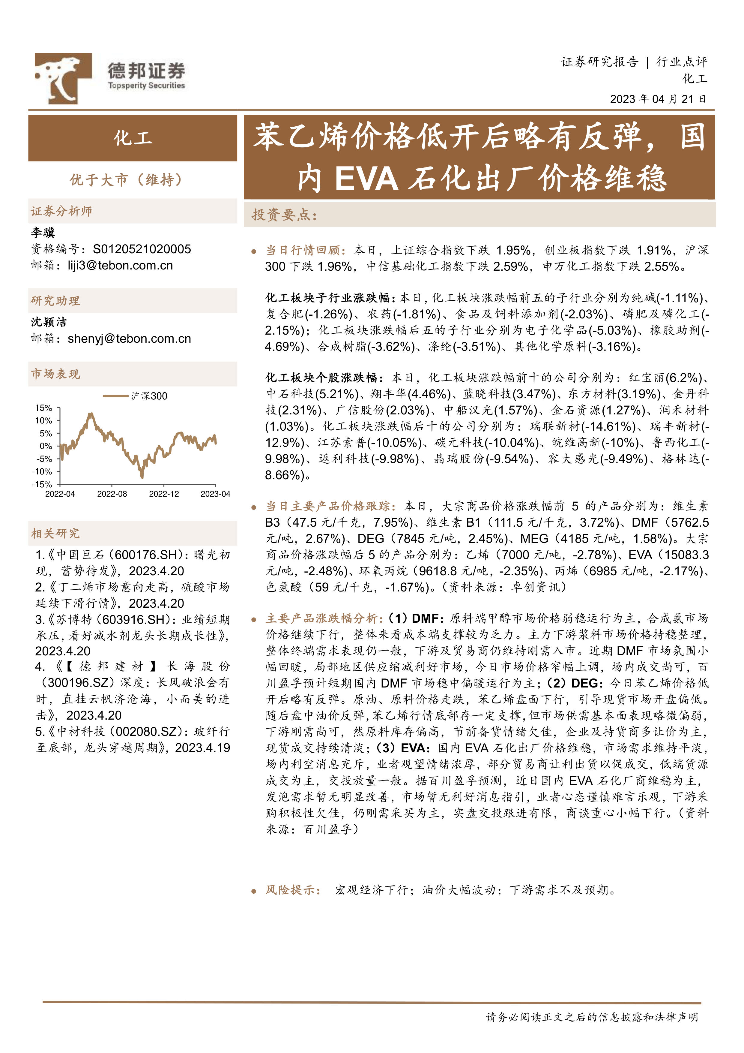 本报告的核心观点是:4月21日,化工板块整体表现弱于大市,主要子行业及个股涨跌幅分化明显。大宗商品价格波动较大,DMF、DEG、EVA等产品价格涨跌互现,反映出市场供需矛盾和宏观经济环境的影响。报告对DMF、DEG、EVA三种主要产品的价格走势进行了分析,并指出了未来市场面临的风险。