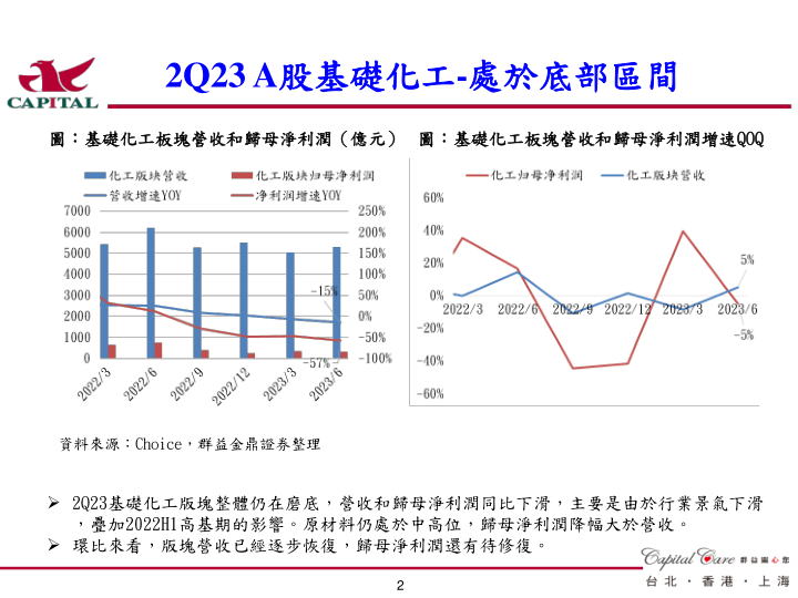 2Q23基础化工版块整体仍在磨底,营收和归母净利润同比下滑,主要是由於行业景气下滑,叠加2022H1高基期的影响。原材料仍处於中高位,归母净利润降幅大於营收。