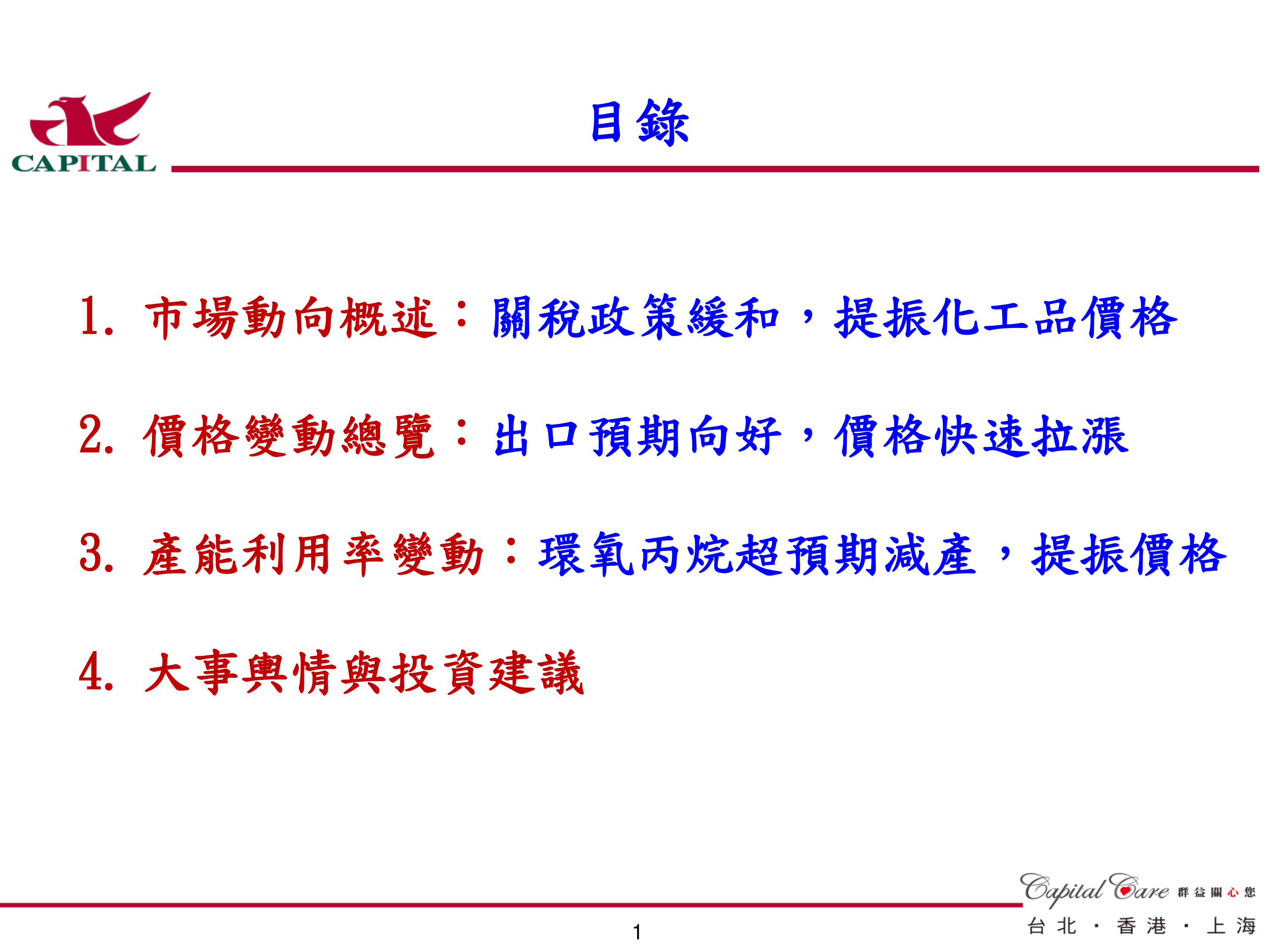 本报告基于群益金鼎证券的周报数据,对中国大陆能源化工市场进行了深入分析。报告指出,中美贸易关系的缓和对化工品价格产生了积极影响,特别是PX-PTA-聚酯产业链和环氧丙烷价格上涨明显。然而,能源市场则呈现出煤炭价格下跌、原油价格震荡的局面。报告最后给出了具体的投资建议,建议关注受益于中美贸易缓和和供需格局改善的特定产业链和公司。 需要持续关注中美贸易政策的进一步变化以及国际地缘政治局势对市场的影响,才能更准确地预测未来能源化工市场走势。 报告数据显示的产能利用率变化也为市场分析提供了重要的参考依据。