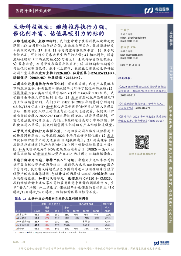 从商业化进展看执行力和催化剂:商业化方面,已有产品获批上市的康方生物、和黄医药和诺诚健华均取得了较优异的成绩:1)诺诚健华3Q22奥布替尼销售环比2Q增长64%至1.83亿元,我们预计全年收入有望达到6亿;2)康方首款双抗产品开坦尼®7月上市后销售顺利,我们预计2H22和2023年销售将分别达到4.6亿/13.9亿元;3)和黄核心产品爱优特®和苏泰达®进入医保目录后,借助800人以上的自主商业化团队迅速放量,我们预计肿瘤业务综合收入2022-24ECAGR将达到35%。近期医保谈判,可重点关注康方的开坦尼,我们认为最终定价或好于市场预期,但即使未进入医保,强大的销售团队仍将助力产品继续快速放量。