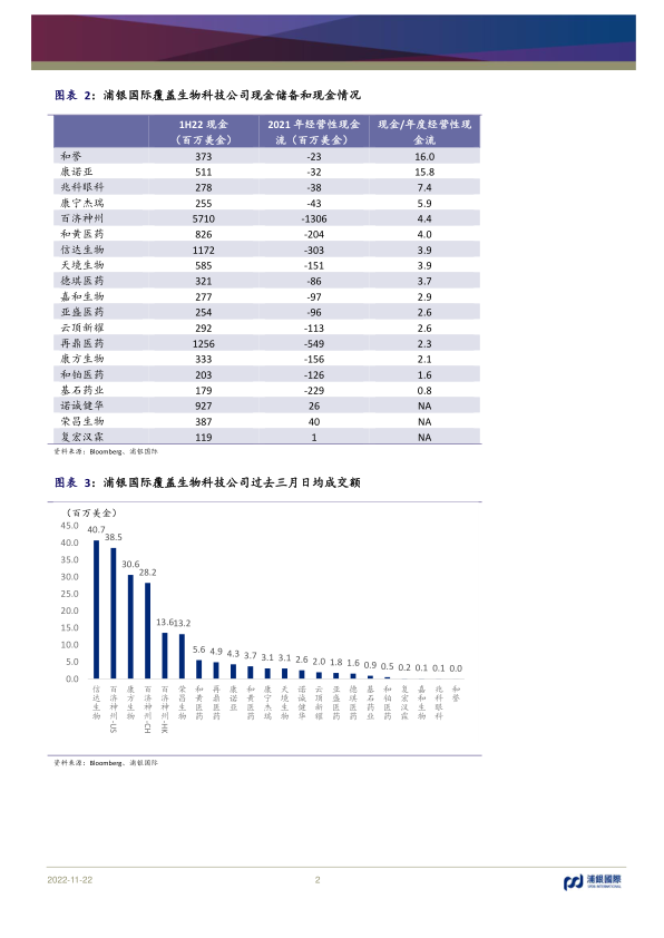 报告提供了多张图表,展示了浦银国际覆盖的生物科技公司现金储备、日均成交额、财务预测、估值等数据,并对重点推荐公司与同行业公司进行了估值比较,以支持其投资建议。