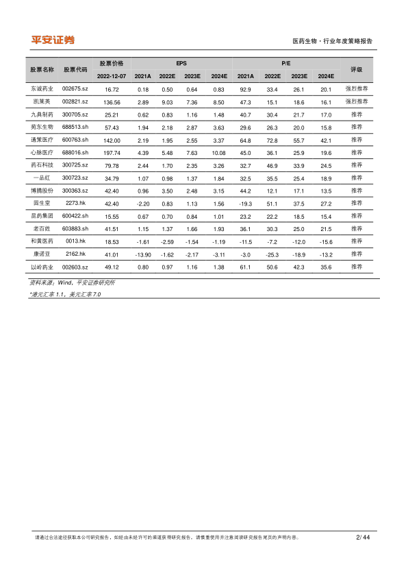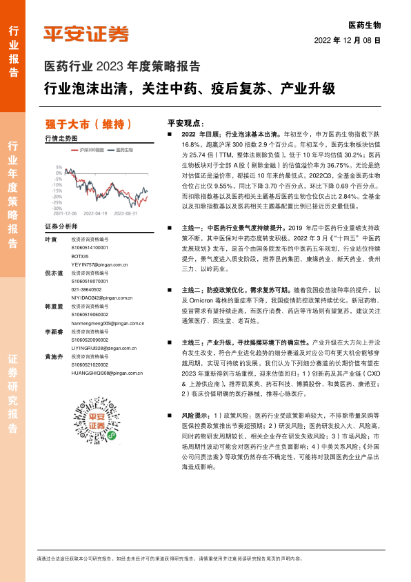 风险提示:1)政策风险:医药行业受政策影响较大,不排除带量采购等医保控费政策推出节奏超预期;2)研发风险:医药研发投入大、风险高,同时药物研发周期较长,相关企业存在研发失败风险;3)市场风险:市场周期性波动可能会对医药行业产生负面影响;4)中美关系风险:《外国公司问责法案》等政策仍然存在不确定性,可能将对我国医药企业产品出海造成影响。
