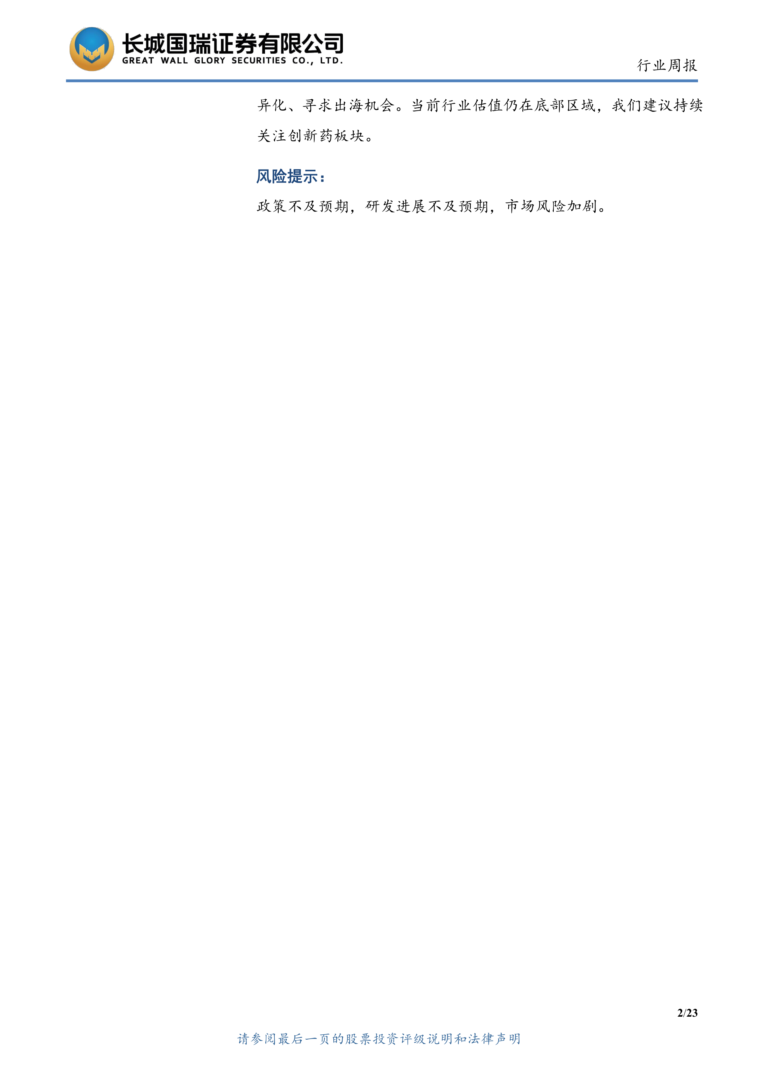 近期, 君实生物的特瑞普利单抗的“高价” 出海给创新药领域打了一针强心剂。 2023 年医保谈判已经结束, 谈判结果或将在这个月底公布。 当前处于行业“业绩真空期” , 今年创新药板块支付端出现边际改善、 内卷程度得到一定改善, 企业从临床需求出发积极探索打造差异化、 寻求出海机会。 当前行业估值仍在底部区域, 我们建议持续关注创新药板块。