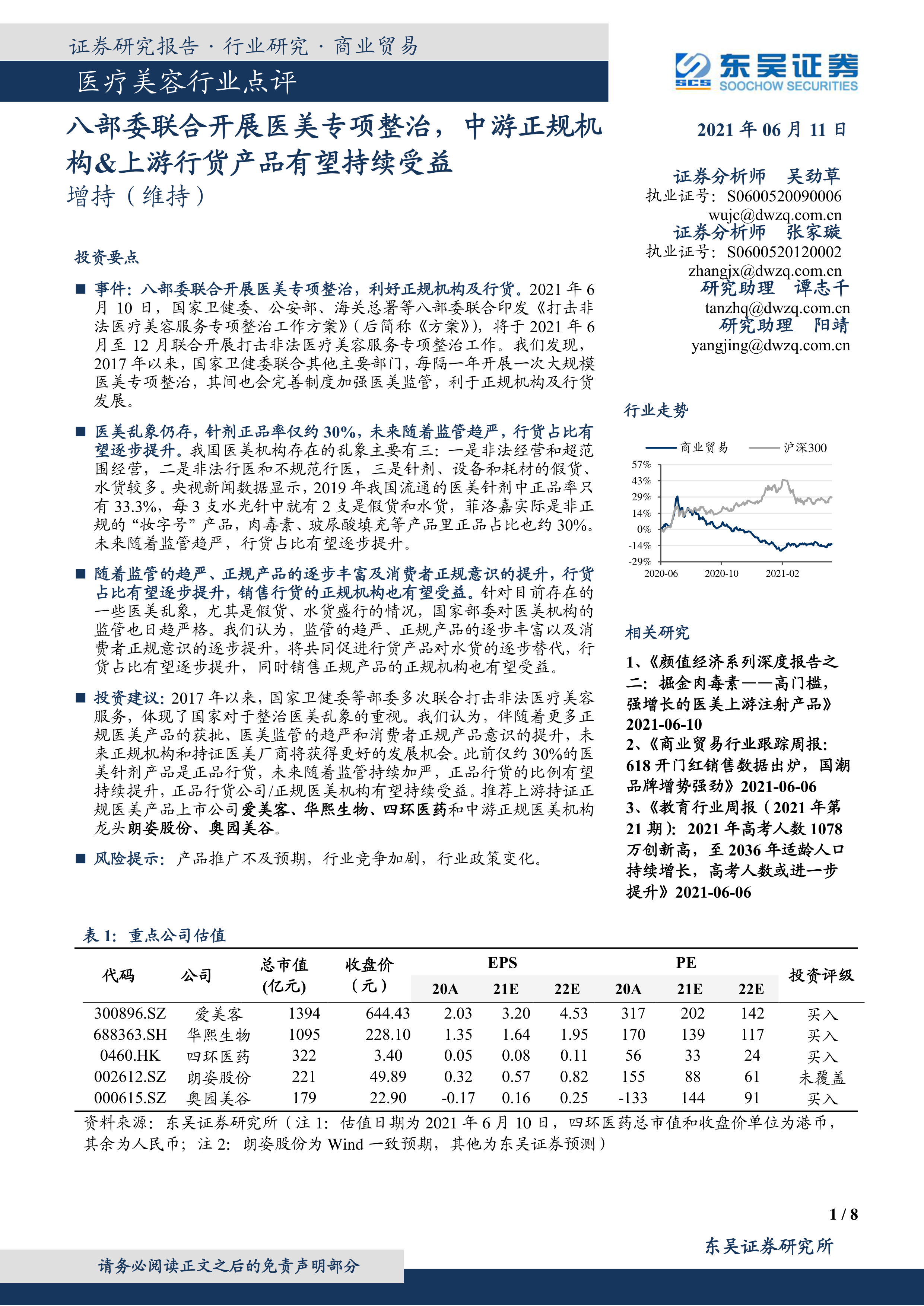 投资建议:2017年以来,国家卫健委等部委多次联合打击非法医疗美容服务,体现了国家对于整治医美乱象的重视。我们认为,伴随着更多正规医美产品的获批、医美监管的趋严和消费者正规产品意识的提升,未来正规机构和持证医美厂商将获得更好的发展机会。此前仅约30%的医美针剂产品是正品行货,未来随着监管持续加严,正品行货的比例有望持续提升,正品行货公司/正规医美机构有望持续受益。推荐上游持证正规医美产品上市公司爱美客、华熙生物、四环医药和中游正规医美机构龙头朗姿股份、奥园美谷。
