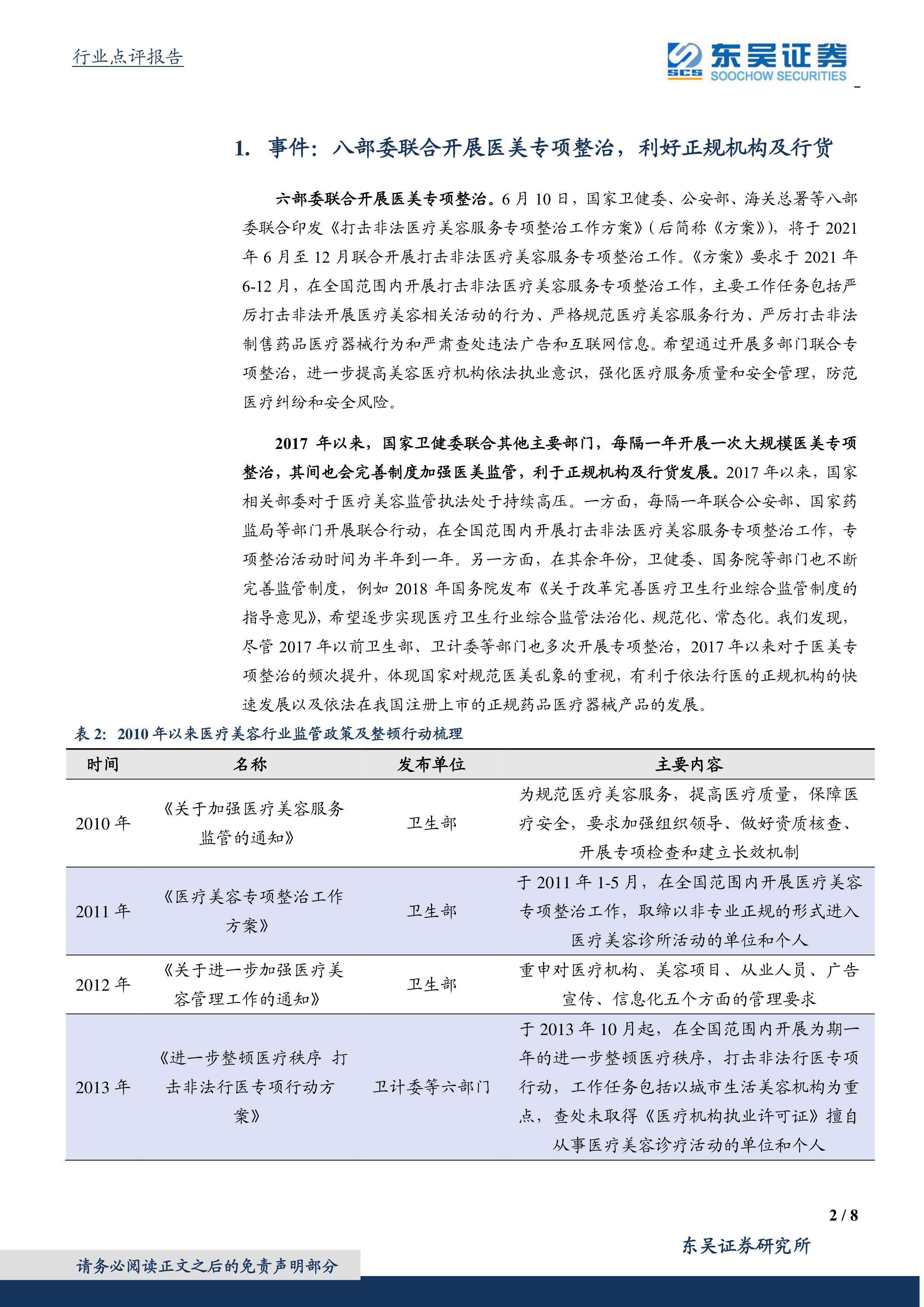 事件:八部委联合开展医美专项整治,利好正规机构及行货。2021年6月10日,国家卫健委、公安部、海关总署等八部委联合印发《打击非法医疗美容服务专项整治工作方案》(后简称《方案》),将于2021年6月至12月联合开展打击非法医疗美容服务专项整治工作。我们发现,2017年以来,国家卫健委联合其他主要部门,每隔一年开展一次大规模医美专项整治,其间也会完善制度加强医美监管,利于正规机构及行货发展。