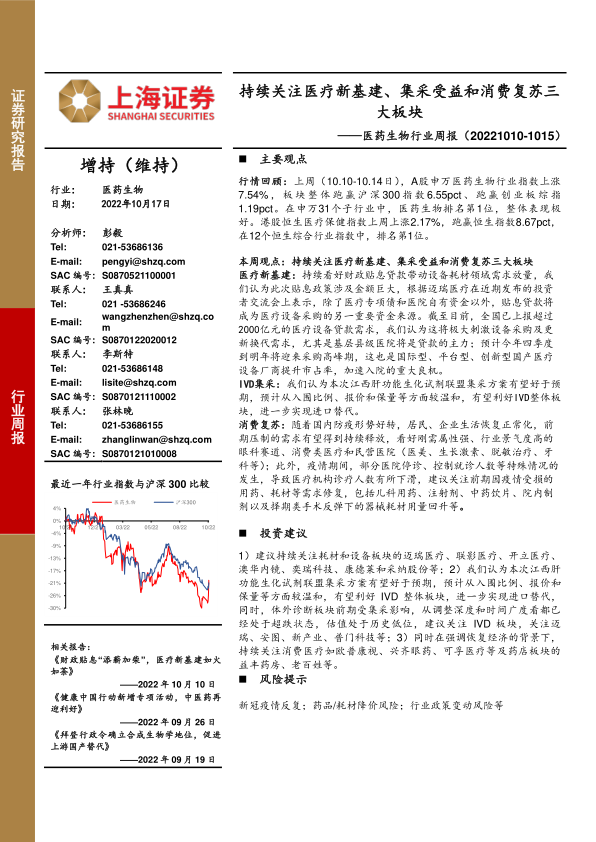 本报告的核心观点是:医药生物行业近期表现强劲,A股和港股市场均跑赢大盘。未来值得关注的三个主要板块是医疗新基建、集采受益板块和消费复苏板块。报告建议持续关注相关领域的优质公司,并提示了投资风险。