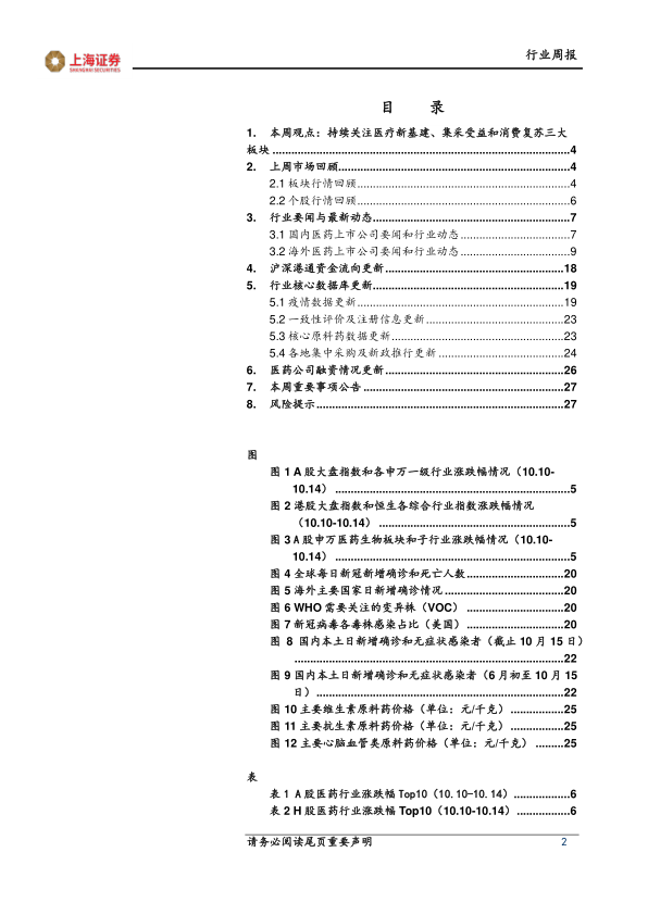 报告最后列出了投资医药生物行业的风险提示,包括新冠疫情反复、药品/耗材降价风险以及行业政策变动风险等。