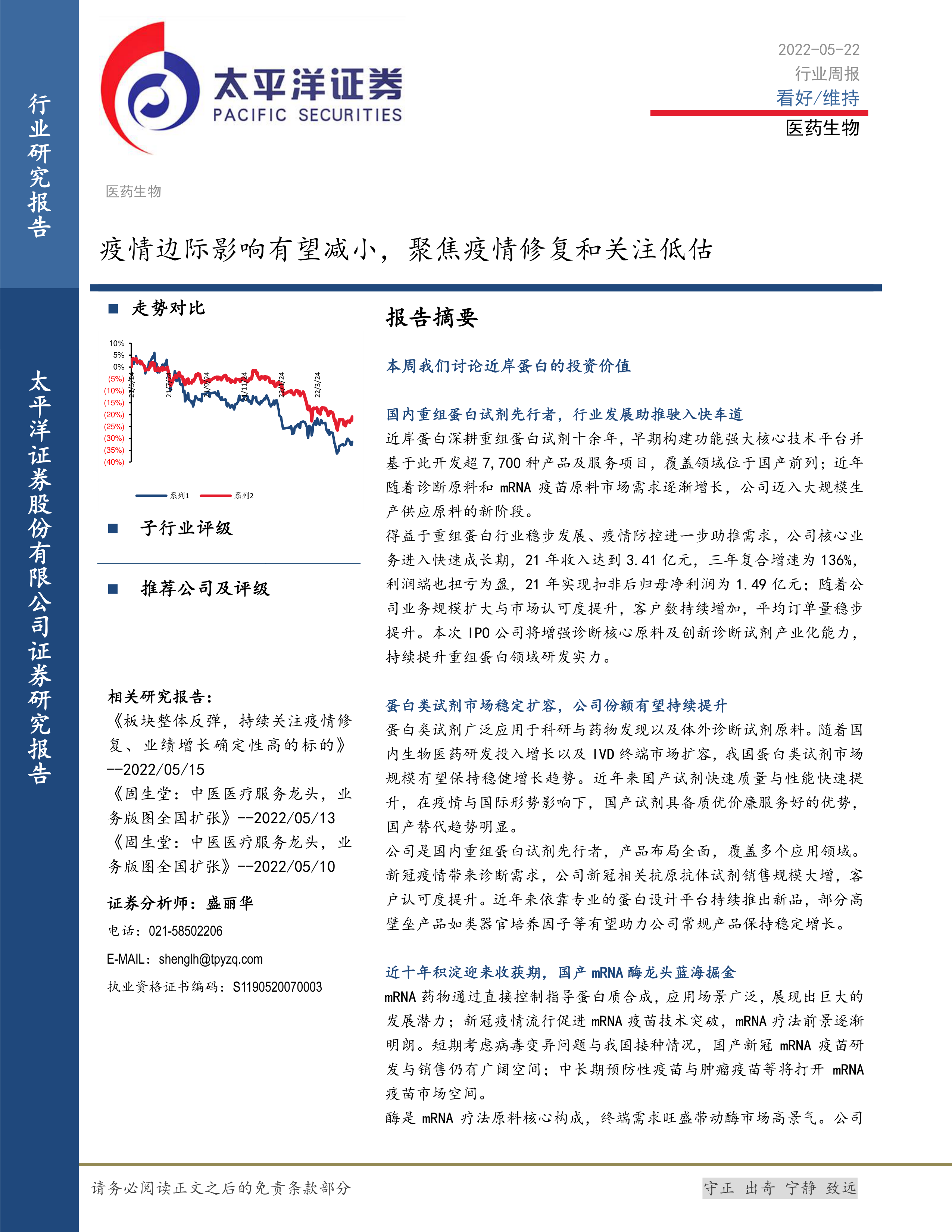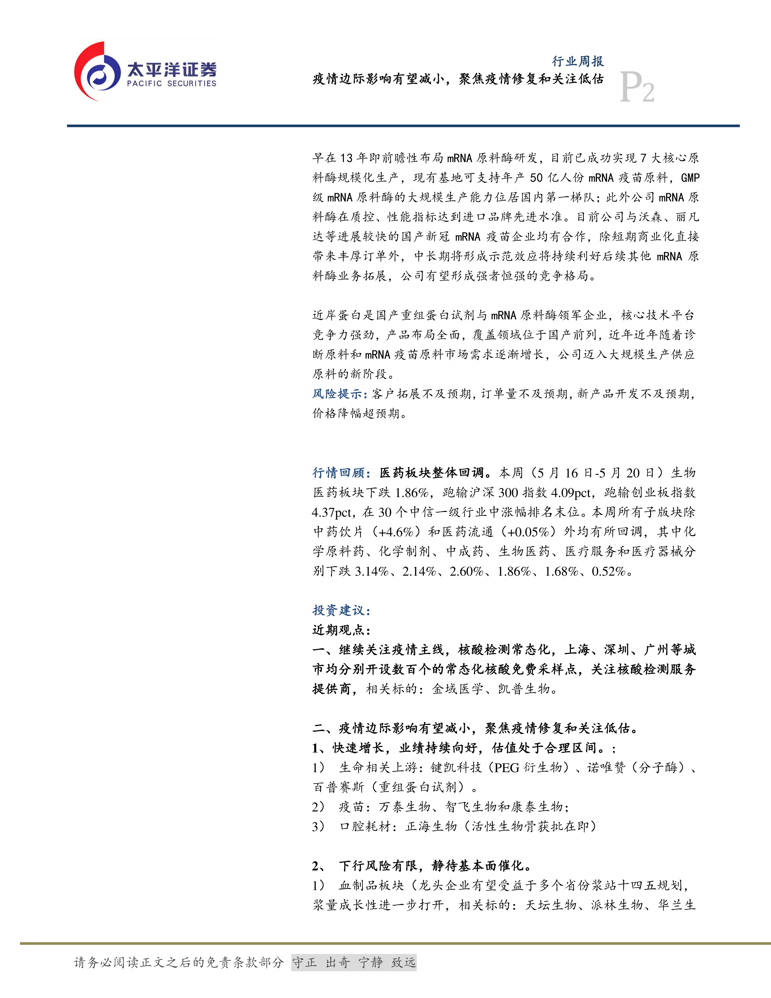 本报告对近岸蛋白的投资价值进行了深入分析,认为其在重组蛋白试剂和mRNA原料酶领域拥有显著的竞争优势,未来发展潜力巨大。同时,报告对医药行业整体进行了分析,指出疫情边际影响逐渐减小,建议关注疫情修复带来的投资机会以及估值处于合理区间或低估的标的。 报告还强调了医药产业制造升级、竞争力提升以及国际化进程加速等长期趋势,为投资者提供了全面的市场分析和投资建议。 需要注意的是,报告中提到的投资建议仅供参考,不构成投资建议,投资者应根据自身情况进行独立判断。
