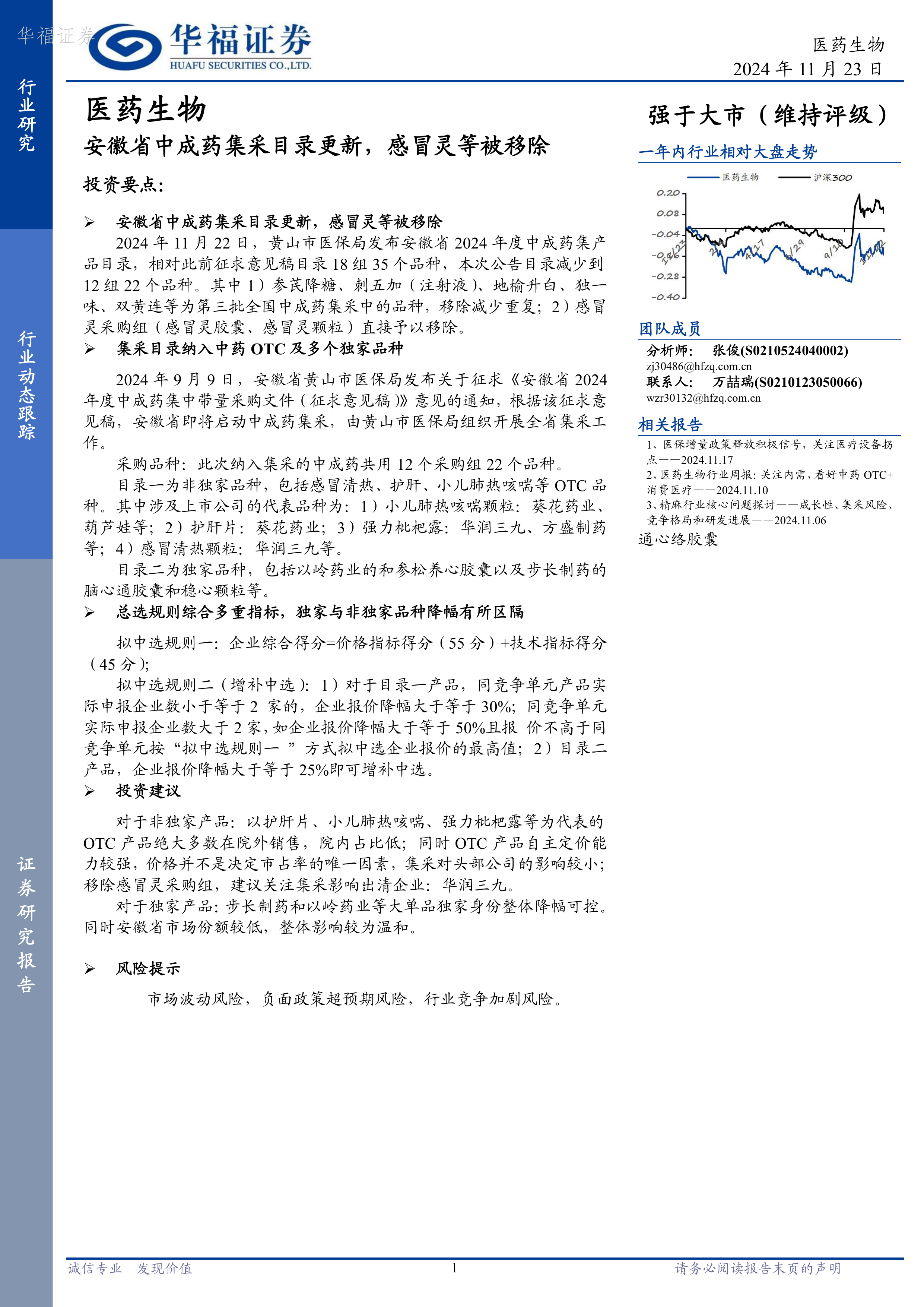 本报告基于安徽省2024年度中成药集采目录的更新,对医药行业,特别是中成药行业进行了分析。报告指出,集采政策对不同类型中成药企业的影响存在差异,独家品种和非独家品种企业面临的挑战和机遇不同。报告建议投资者关注集采政策对企业的影响,并谨慎评估投资风险。 报告强调了集采政策对市场规范化和资源优化配置的积极作用,同时也指出了部分企业可能面临的挑战,为投资者提供了更全面的市场分析和投资建议。 未来,持续关注集采政策的动态变化以及企业应对策略将对投资决策至关重要。