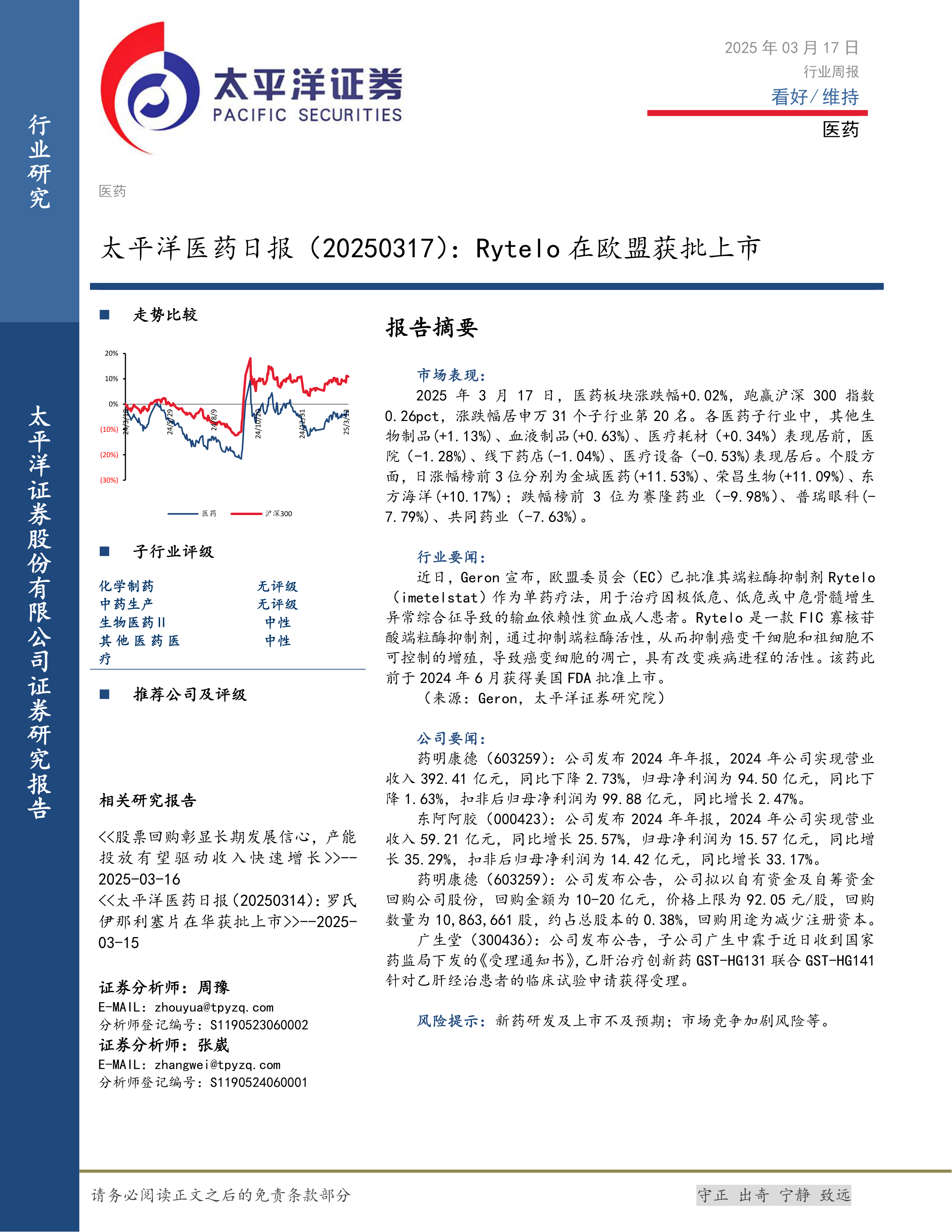 本报告的核心观点是:2025年3月17日,医药板块整体表现略微上涨,跑赢沪深300指数,但子行业表现分化明显。Rytelo在欧盟获批上市是重要的行业利好消息,但个股涨跌幅度较大,体现出市场波动性。部分公司发布了2024年年报,业绩表现差异显著,反映出医药行业内部竞争激烈以及发展的不均衡性。