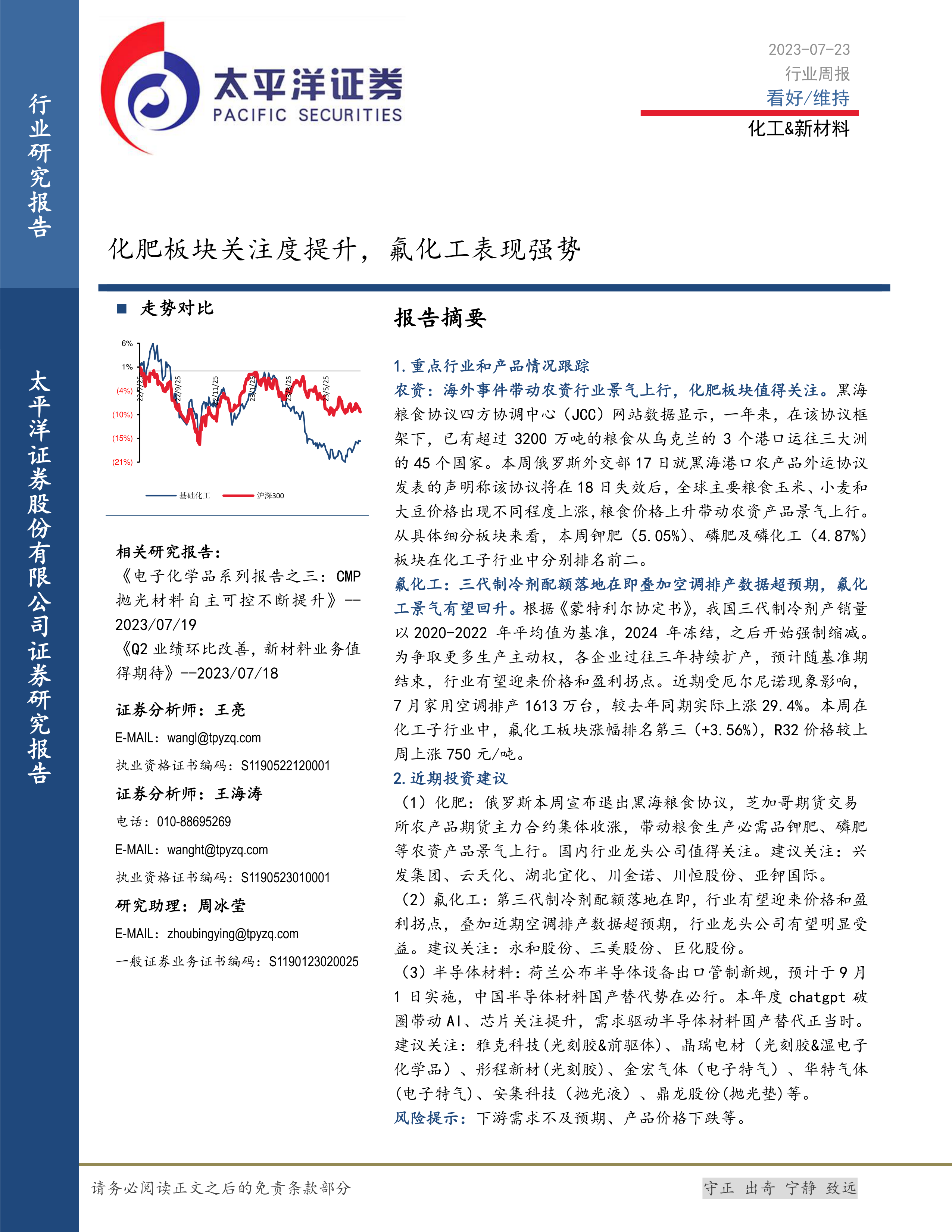 化工&新材料行业周报:化肥板块关注度提升,氟化工表现强势