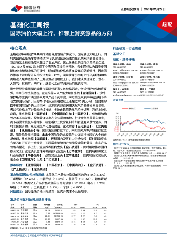 海外钾肥补库周期启动叠加国际钾肥寡头的价格诉求,全球钾肥价格触底反弹,中期价格拐点显现,重点推荐未来产能大幅扩张的【亚钾国际】。沙特、俄罗斯等主要产油国将自愿减产延长到年底,同时美国原油库存超预期下降也支撑国际油价,因此布伦特原油价格继续上涨超过95美元/桶,我们看好四季度国际油价的上行空间,近期国内终端民用天然气价格开始密集调整,天然气价格上下游联动持续推进,多地市民用天然气价格调整,利好上游供应商,重点推荐【中国石油】、【中国海油】和【中国石化】。供给侧结构性改革不断深化、配额管理近期在立法层面落地、行业竞争格局趋向集中,而下游需求恢复平稳增长,我们看好三代含氟制冷剂有望迎来景气复苏,同时含氟聚合物、氟化液国产化进程提速,重点推荐【巨化股份】、【三美股份】、【永和股份】等。国际海运费持续下行,同时国内汽车产销量持续走高,海外轮胎需求回暖,未来中国轮胎的比较竞争力优势将持续扩大全球市场份额,重点推荐【森麒麟】。近期国内萤石矿山供给收缩,同时四季度北方萤石矿开采进一步受限,下游需求继续回升继续拉动萤石需求,未来产品价格有望进一步上行,重点推荐国内龙头【金石资源】。同时继续推荐国内综合化工行业龙头及全球异氰酸酯行业龙头【万华化学】,国内精细煤化工行业领先者【华鲁恒升】,煤制烯烃龙头【宝丰能源】,国内轻质化烯烃代表企业【卫星化学】以及【广汇能源】。