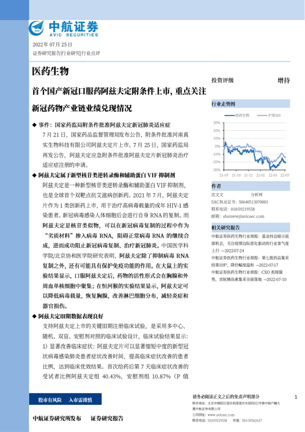 医药生物:首个国产新冠口服药阿兹夫定附条件上市,重点关注新冠药物产业链业绩兑现情况