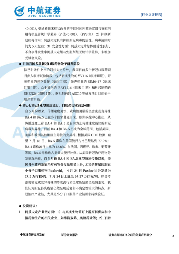 3.国内首个小分子新冠口服药阿兹夫定的获批具有里程碑的意义,综合考虑海内外新冠药物的研发和商业化进展,市场关注的重心已经由研发进展预期进入到业绩兑现的阶段,建议重点关注新冠产业链相关企业的商业化能力和综合竞争力,包括复星医药、奥翔药业等,同时关注深度参与新冠治疗药物供应链的CDMO企业,包括凯莱英、博腾股份等。