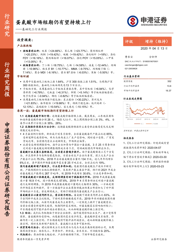 本报告主要围绕蛋氨酸市场行情、涨价原因、行业分析以及投资建议展开,并对基础化工行业整体市场行情进行了简要概述。