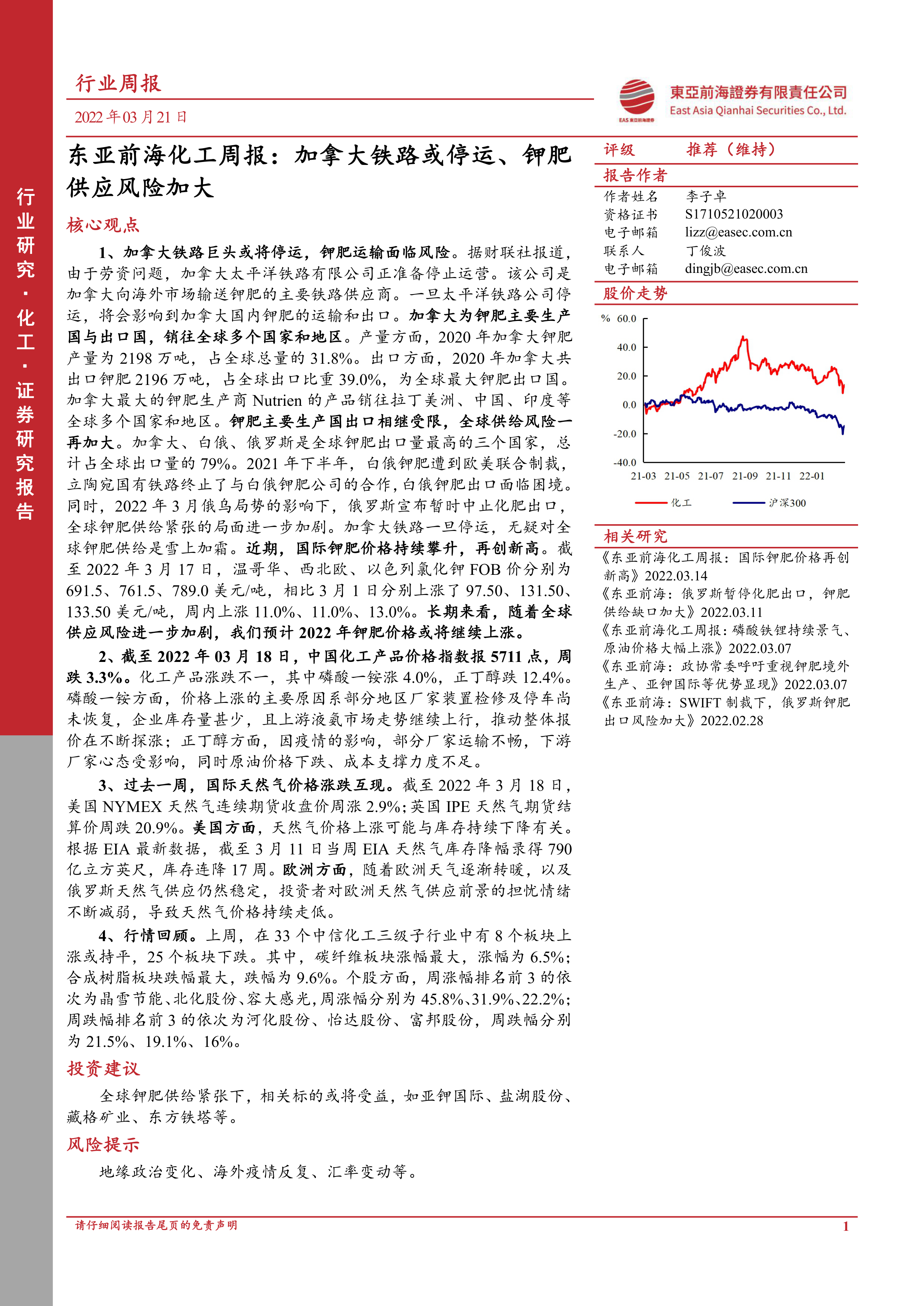 1、 加拿大铁路巨头或将停运, 钾肥运输面临风险。 据财联社报道,由于劳资问题, 加拿大太平洋铁路有限公司正准备停止运营。 该公司是加拿大向海外市场输送钾肥的主要铁路供应商。 一旦太平洋铁路公司停运, 将会影响到加拿大国内钾肥的运输和出口。 加拿大为钾肥主要生产国与出口国, 销往全球多个国家和地区。 产量方面, 2020 年加拿大钾肥产量为 2198 万吨, 占全球总量的 31.8%。 出口方面, 2020 年加拿大共出口钾肥 2196 万吨, 占全球出口比重 39.0%, 为全球最大钾肥出口国。加拿大最大的钾肥生产商 Nutrien 的产品销往拉丁美洲、 中国、 印度等全球多个国家和地区。 钾肥主要生产国出口相继受限, 全球供给风险一再加大。 加拿大、 白俄、 俄罗斯是全球钾肥出口量最高的三个国家, 总计占全球出口量的 79%。 2021 年下半年, 白俄钾肥遭到欧美联合制裁,立陶宛国有铁路终止了与白俄钾肥公司的合作, 白俄钾肥出口面临困境。同时, 2022 年 3 月俄乌局势的影响下, 俄罗斯宣布暂时中止化肥出口,全球钾肥供给紧张的局面进一步加剧。 加拿大铁路一旦停运, 无疑对全球钾肥供给是雪上加霜。 近期, 国际钾肥价格持续攀升, 再创新高。 截至 2022 年 3 月 17 日, 温哥华、 西北欧、 以色列氯化钾 FOB 价分别为691.5、 761.5、 789.0 美元/吨, 相比 3 月 1 日分别上涨了 97.50、 131.50、133.50 美元/吨, 周内上涨 11.0%、 11.0%、 13.0%。 长期来看, 随着全球供应风险进一步加剧, 我们预计 2022 年钾肥价格或将继续上涨。