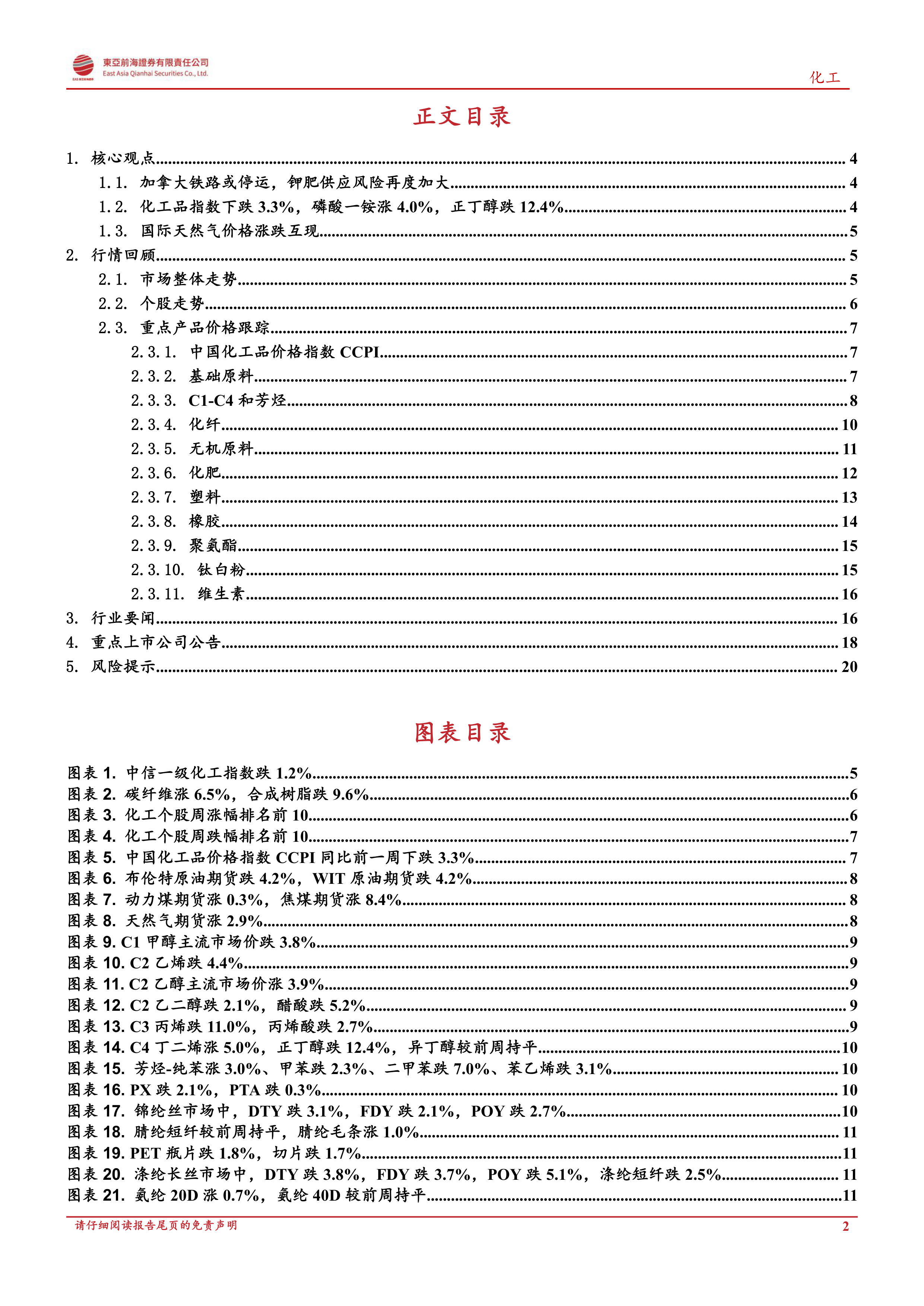 本报告的核心观点是:加拿大铁路潜在停运以及此前白俄罗斯和俄罗斯钾肥出口受限,共同导致全球钾肥供应风险急剧增加,国际钾肥价格持续攀升,并可能进一步上涨。同时,报告也分析了中国化工产品价格指数的波动以及国际天然气价格的涨跌互现,并对部分化工上市公司的业绩和投资项目进行了简要概述。